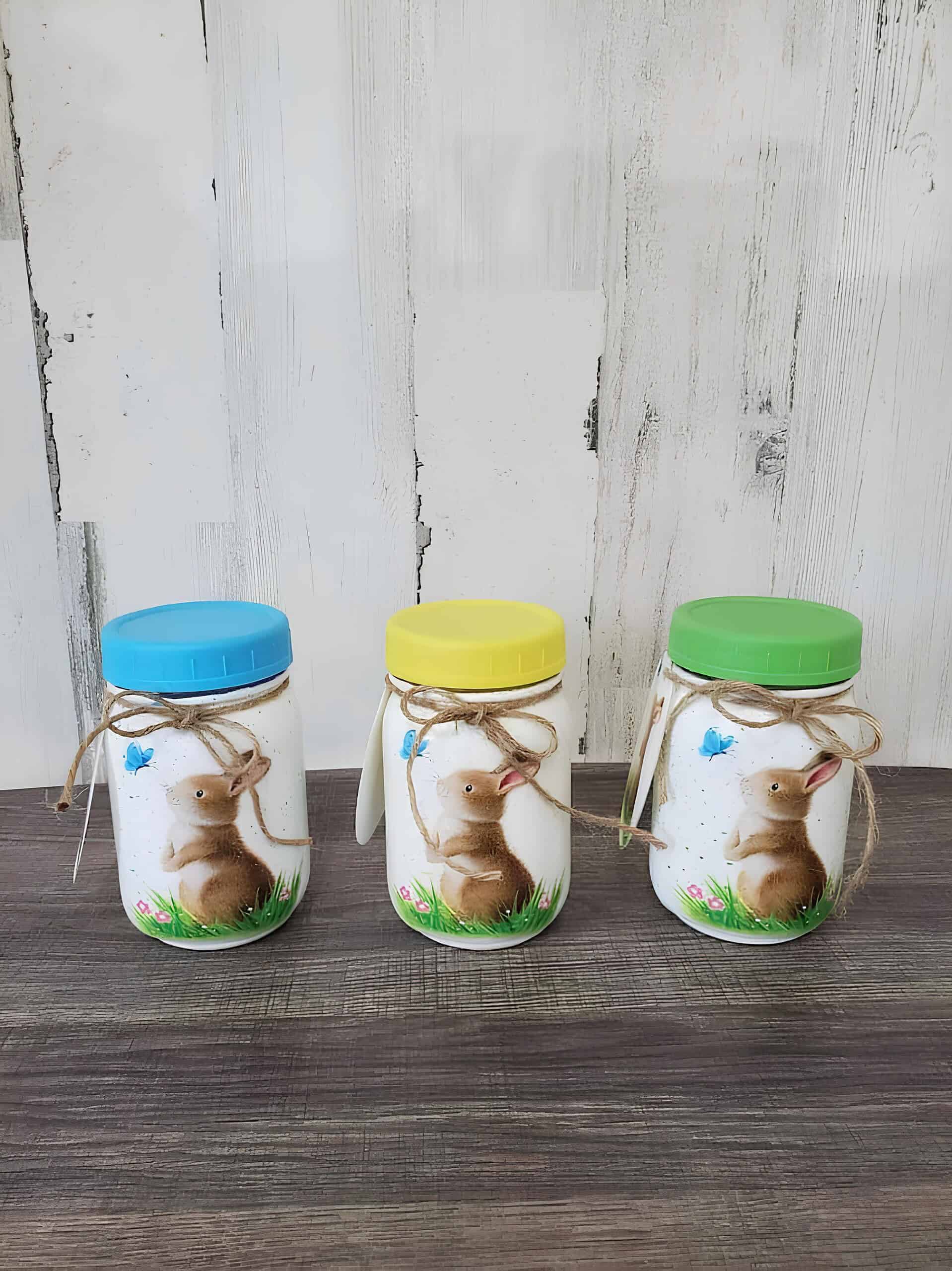 Bring vibrant charm to your Easter celebration with this set of hand-painted bunny mason jars, perfect for outdoor displays or rustic spring décor.