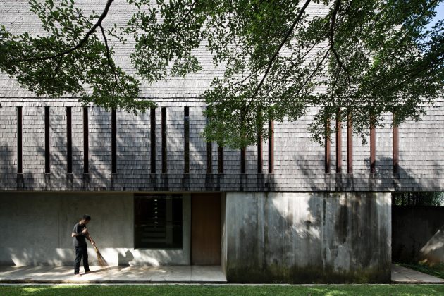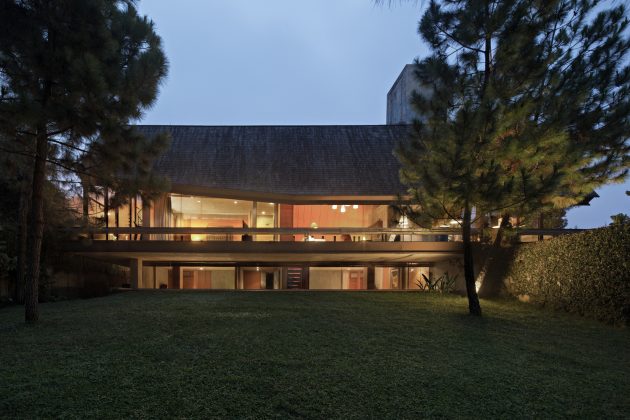 While on the first floor has a semi-outdoor balcony, living area, dining area and reading lounge in the mezzanine. This row of areas is separated with a fireplace and sliding glass doors that would be opened daily and connected with a large, long balcony that stretches along the side of the residence. The composition of the mansard roof was developed through constructions and new architectural details, an approach to the locality of the context that is elaborated with new technological novelty. Not only creating a more voluminous space with the fractured form of the roof, but a skylight was also introduced to welcome the sun through the wooden ceiling.