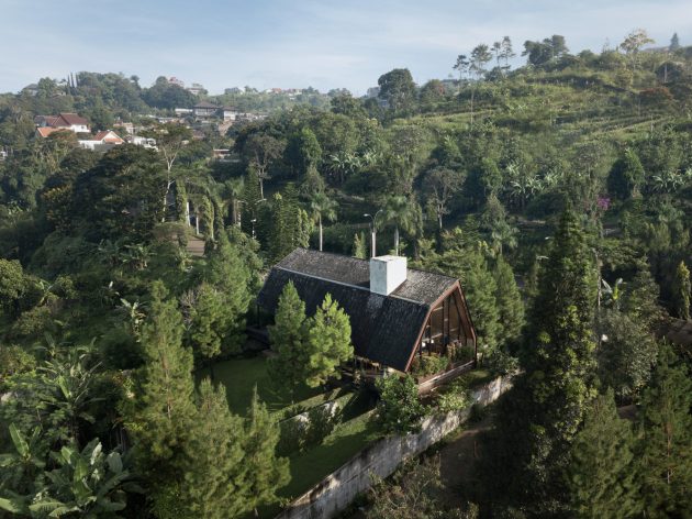 EH House is a beautiful villa designed as a weekend home in the Bandung area of Indonesia. Surrounded by lush greenery, the side facing the main road is completely closed off but the other side opens up to spectacular vistas of the natural environment and the nearby city.