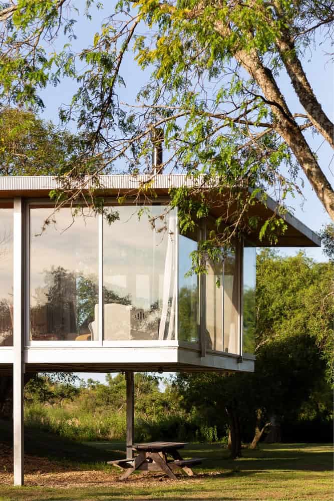 Anchored on El Chirigüe Island along the Lechiguana Stream, the house blends with the terrain through an earthen berm that rises to meet the elevated structure—an architectural embrace between land, water, and sky.