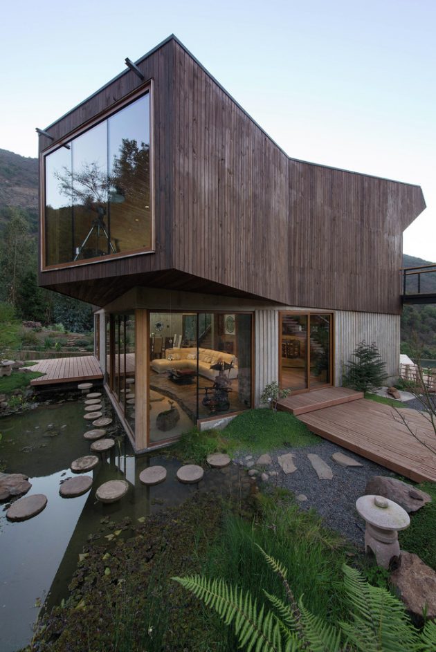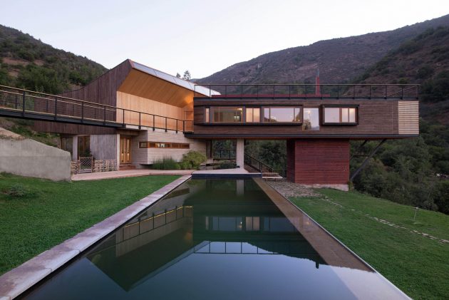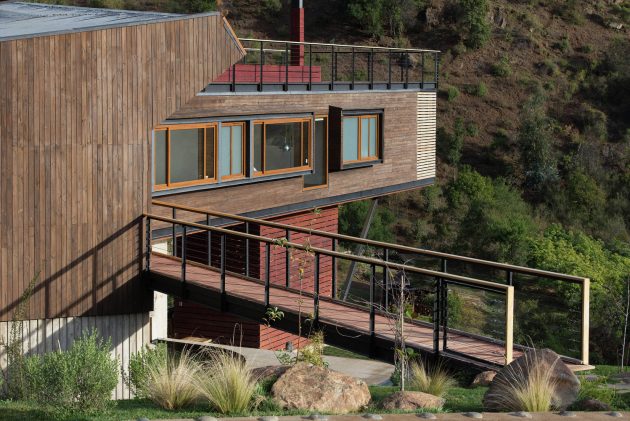From the architects: “The building is located in the eastern hillside of El Maqui Brook, a rural place of The Coastal Mountain Range of Chile. This geographical zone is part of a protected natural reserve with high and important ecological value because its singular and diverse coexisting ecosystems. The client ask for a seasonal house for a family of six and a near garden around the house whose principal element was water. In order not to alter the rich forests and ecosystems we sought an already damaged hillside without vegetation to found the building. The new landscaping project should recover the area. The eastern hillside position assure us prolonged sunlight and optimal exposure to the prevailing ascendant air current.