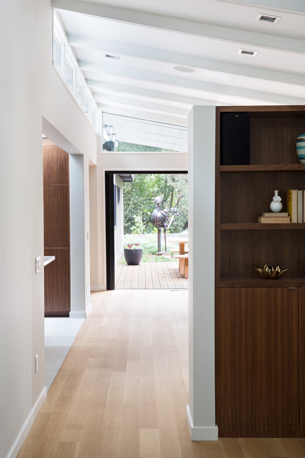 Klopf opened up the bedroom with a large sliding panel, and turned what was once a large walk-in closet into an office area, again with a large sliding panel. The master bathroom has high windows all along one wall to bring in light, and a large wet room area for the shower and tub. The dark, solid roof structure over the patio was replaced with an open trellis that allows plenty of light, brightening the new deck area as well as the interior of the house.