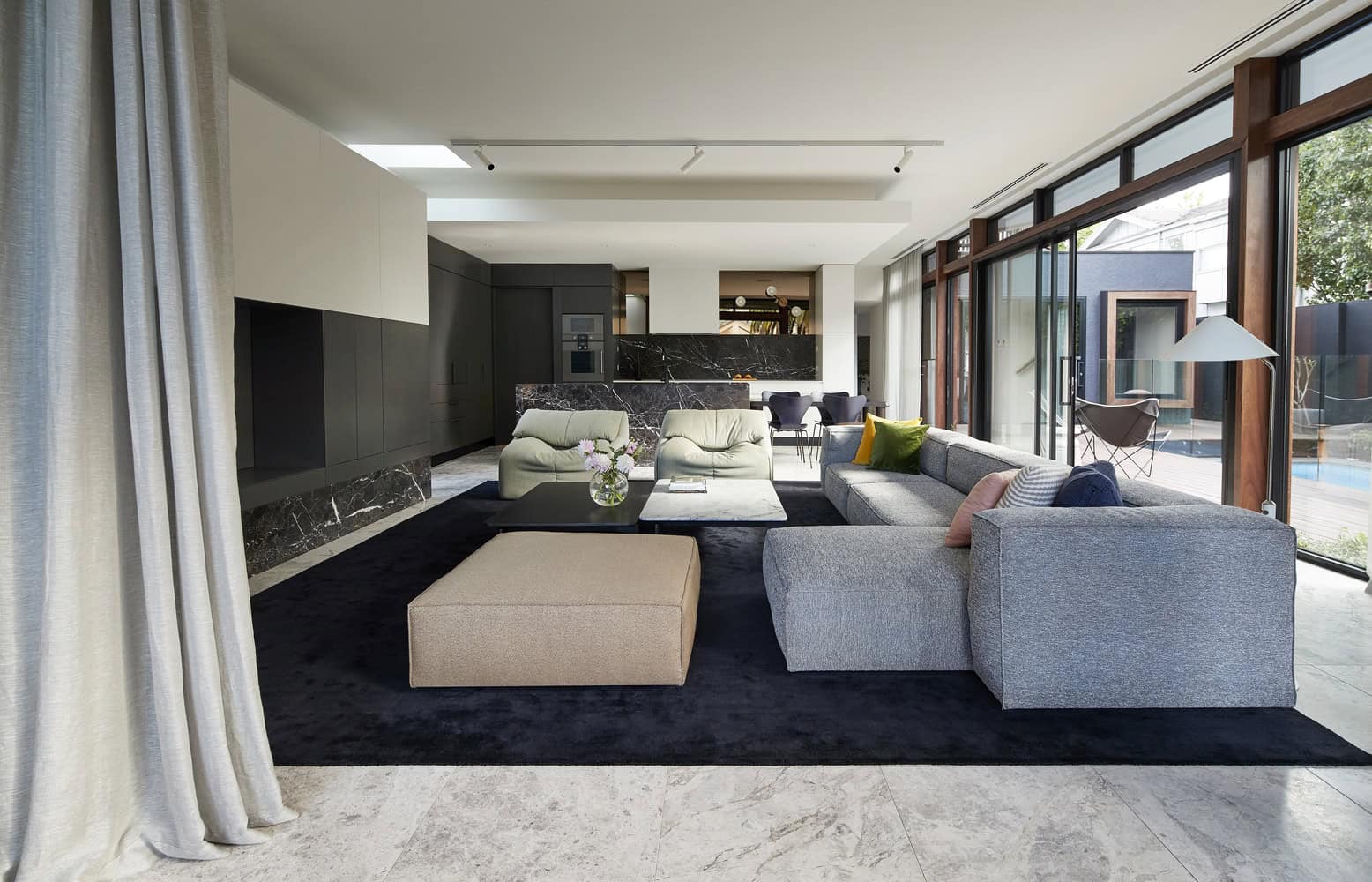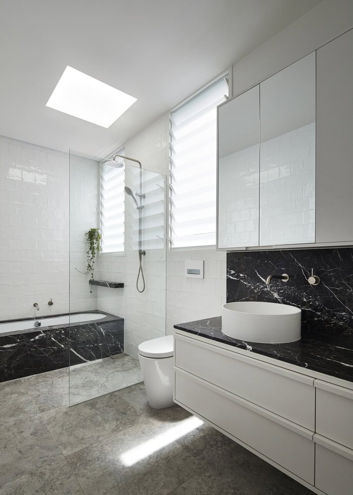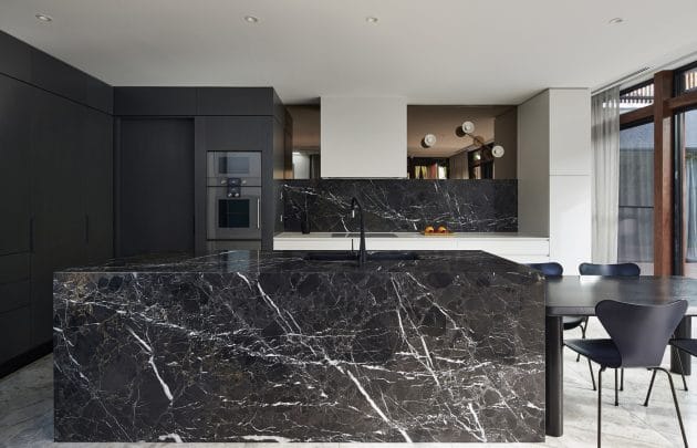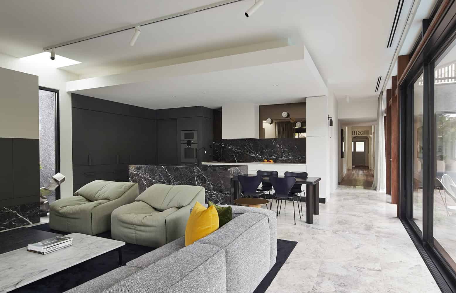 The demolition of the cramped rear section of the house allowed for a new extension to open-up and take better advantage of the north-facing aspect back-garden. The new ground floor addition housing kitchen and living space is juxtaposed with the original house as a streamlined box with floor-to-ceiling glazing, aluminium doors and windows, limestone tiled floor and marble detailing. The transparent box soaks up the natural northern and western light and utilises reflection from the existing pool to further bounce light around the internal space. It is a bright, spacious centre for gathering, sharing and enjoying the connection to the garden, barbeque and pool. The junction between old and new is distinct but fluid. A central spinal hallway links the two halves of the building with walls extending from front to back in a continuous line, creating a long, framed vista.