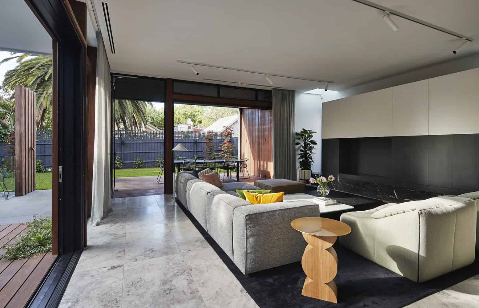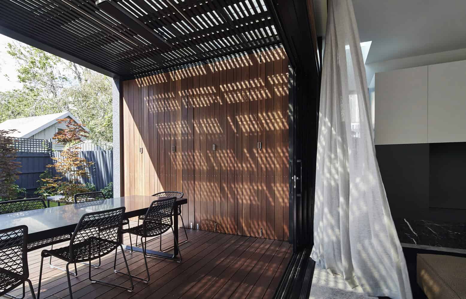 Elwood House provides the multi-dimensionality and flexibility needed for a modern family which is reflected in a range of architectural styles and materials from different eras that have been successfully integrated as an elegant, contemporary home. The extension is respectful of its neighbours and the streetscape; it is not prominent from the street front – there are only glimpses of a modern box behind, modestly set back from its neighbouring buildings. Energy use, solar access, thermal performance, ventilation and water-sensitivity have been considered at all stages of the project to create a house that aims for self-sufficiency and a harmonious relationship with its surrounding landscape. Despite its elegant design credentials, the house is still primarily a home for a young family; joining the daily life of the other parents and children in the local neighbourhood.