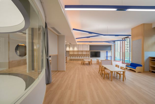 The customized lighting systems emit light upward and downward, diffusing soft and sufficient light to every corner of the space. The lighting system doubles as ceiling hangers that can be used by teachers to create educational atmospheres in the classrooms. The specially designed hand basin ensures that the children don’t splash water on their clothes or over the floor. Altogether, these functional details respect and improve the growth and natural development of children.