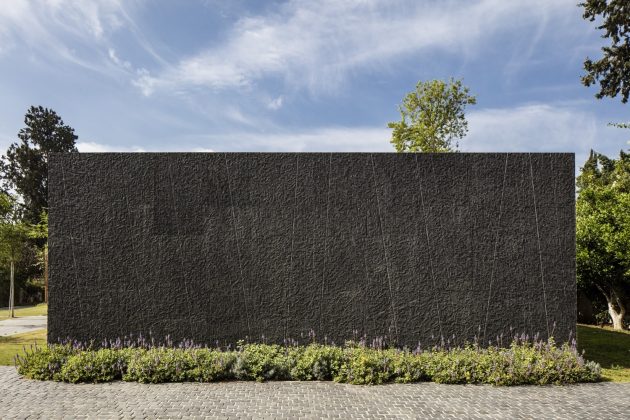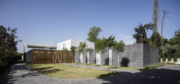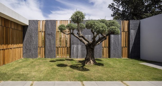 The house under discussion here is about this experience. It is this dynamic that is generated in its design, explaining it to the visitor simply by placing him or her at its center from the first moment they stand in front of the facade facing the street — an opaque monolithic slab, covered in dark stone. The impermeability of the wall is softened by an avenue of young trees directing the visitor along the length of the paved footpath, directly into an inner courtyard surrounded by a semi-opaque stretch of wood, the first in a series of internal courtyards that form a key principle in the design of the house.