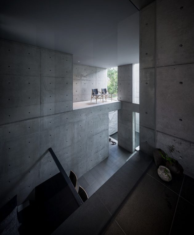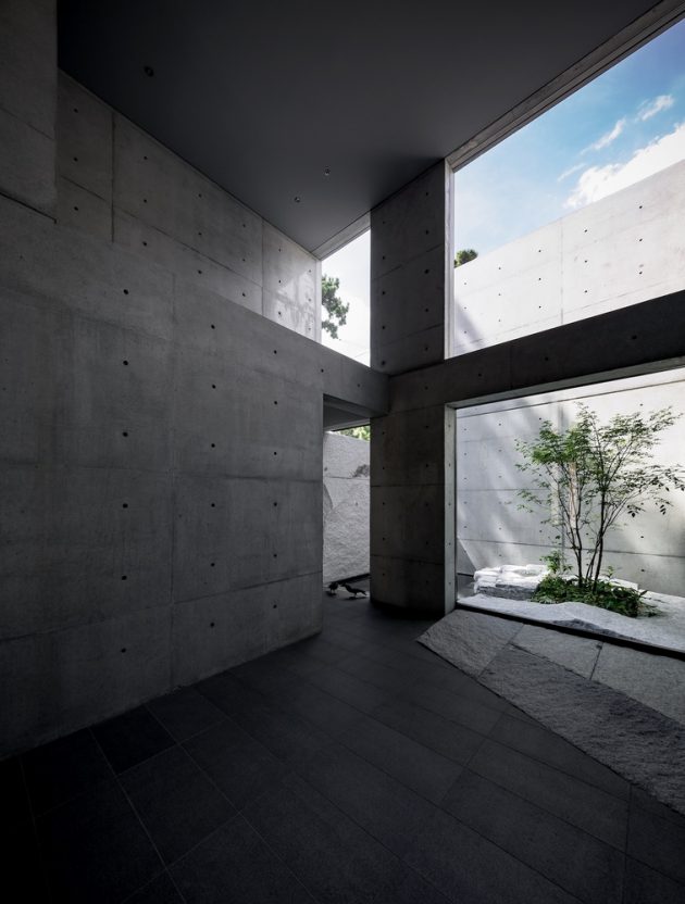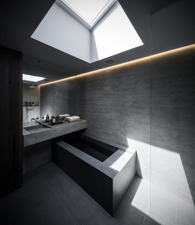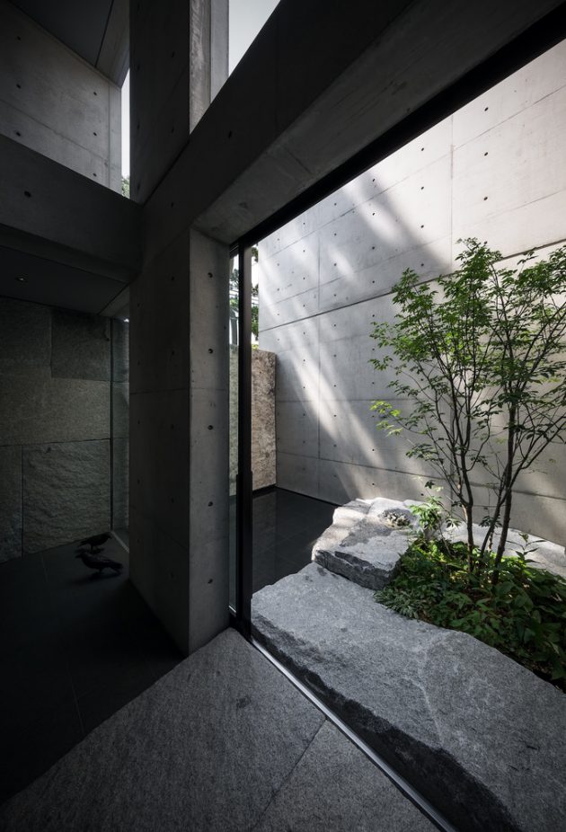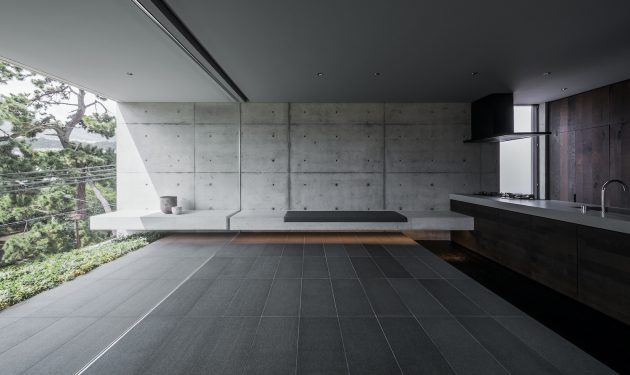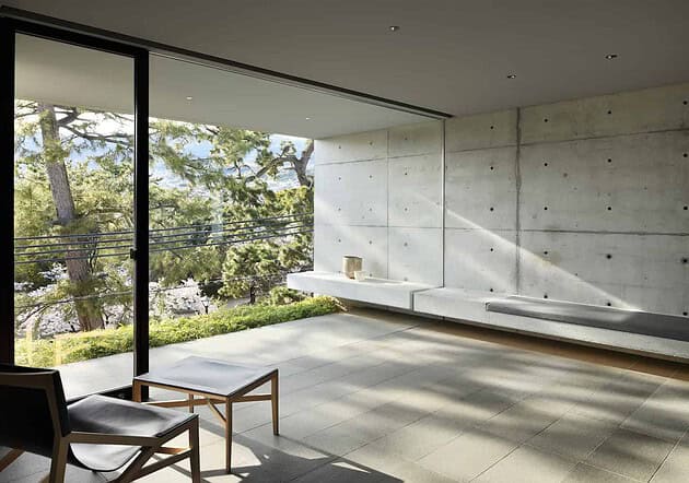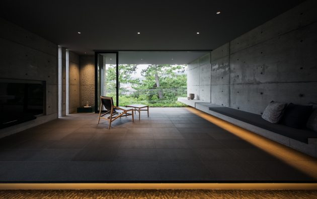 This is a modern minimalist residence dominated by concrete, glass and intimate lighting. Its minimalist interior opens up towards a beautiful view framing cherry blossoms.