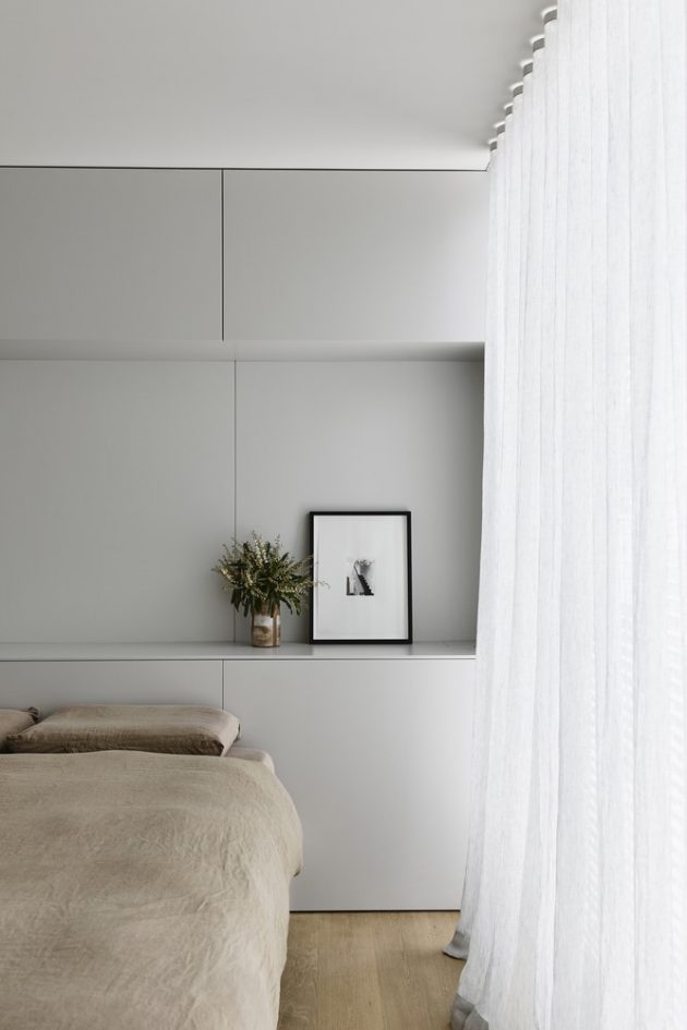 Positioned in the garden is the kitchen, living, and dining space, defined by the boundary to boundary glazed openings that allow for limitless cross ventilation. Throughout the house, there is a continuous theme of concealment, particularly in the doors, joinery, services, gutter detailing, and water storage. This declutters the architecture which in turn reinforces the idea of living in a garden. The close collaboration with Eckersley Garden Architecture allowed this core concept to be realized. ‘Living within a garden and sleeping above it.’