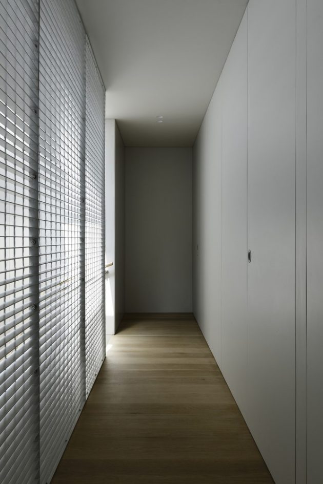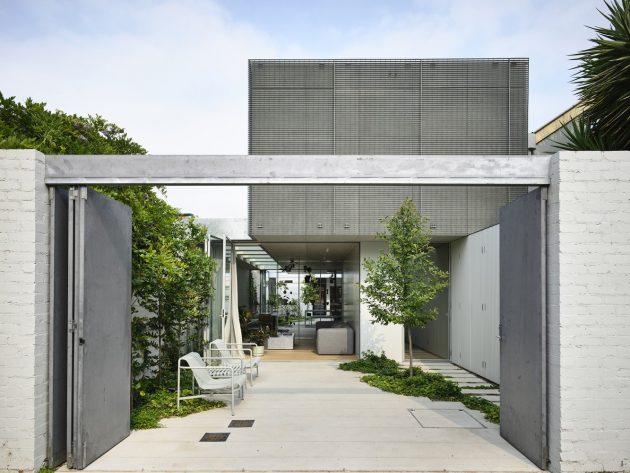 A galvanized metal grid encases, shades, and limits overlooking from the upper floor private domain, comprising three bedrooms and two bathrooms. This calm protected zone hovers above, providing areas of shade for the garden below.