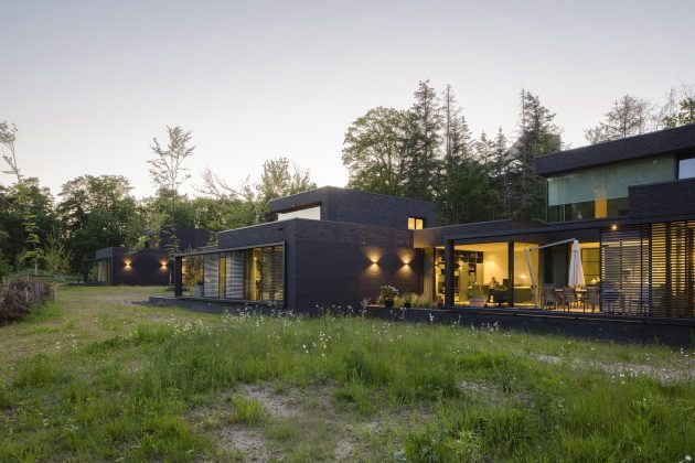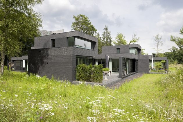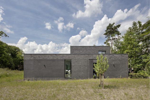 The horizontally arranged villa volumes are being reinforced by elongated bricks laid in courses with deeply recessed horizontal joints. The vertical joints are completely omitted. Two different brick types with subtitle differences in color and layout organize the façade and accentuate the position of entrances and other openings. The dark colors of the partially glazed bricks are discreet and allow trees to dominate the overall impression. The result is a solid and sober ensemble with a timeless ambition.