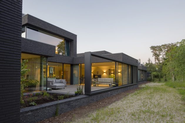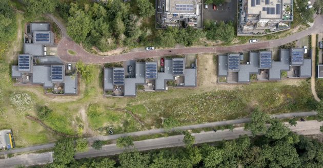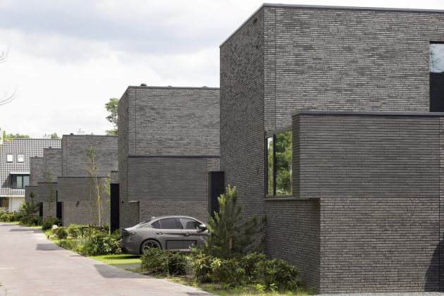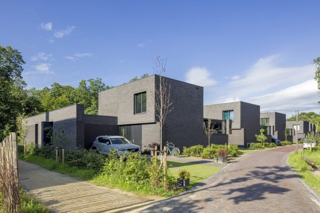 Combined in groups of three, the villas meander through the forest respecting existing trees. They look like dark-bodied brick monoliths carefully integrated into the landscape. The villas are situated on the neighborhood’s edge. They have a relatively closed entrance façade facing the existing apartment buildings behind them. On the opposite side, the villas open themselves completely to the characteristic Utrecht landscape and the sun.