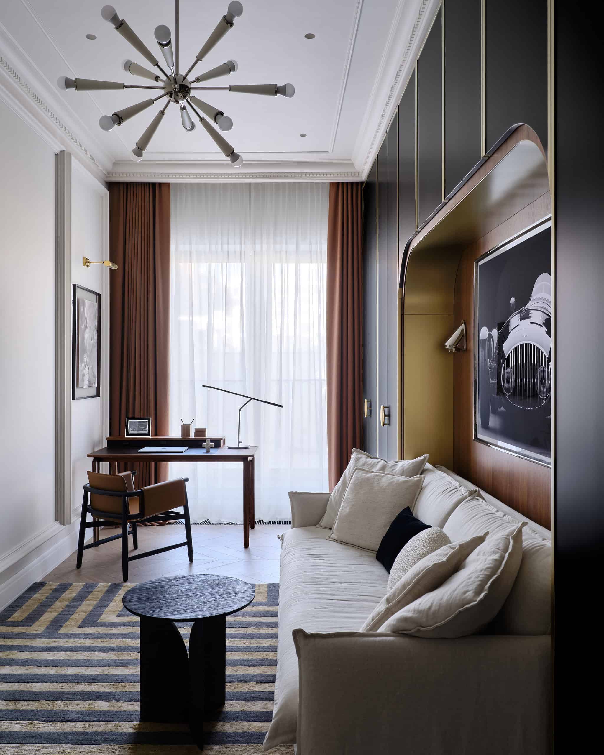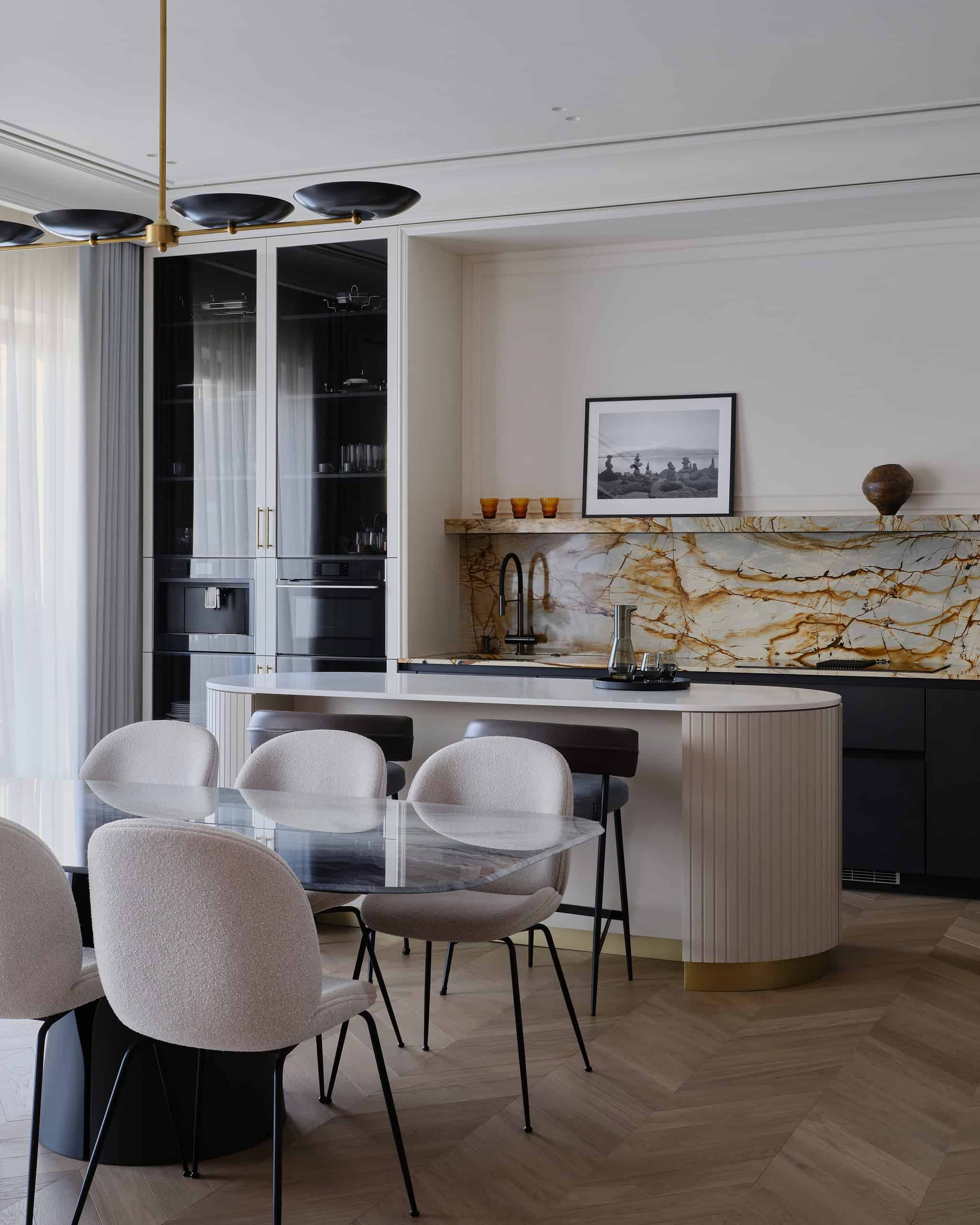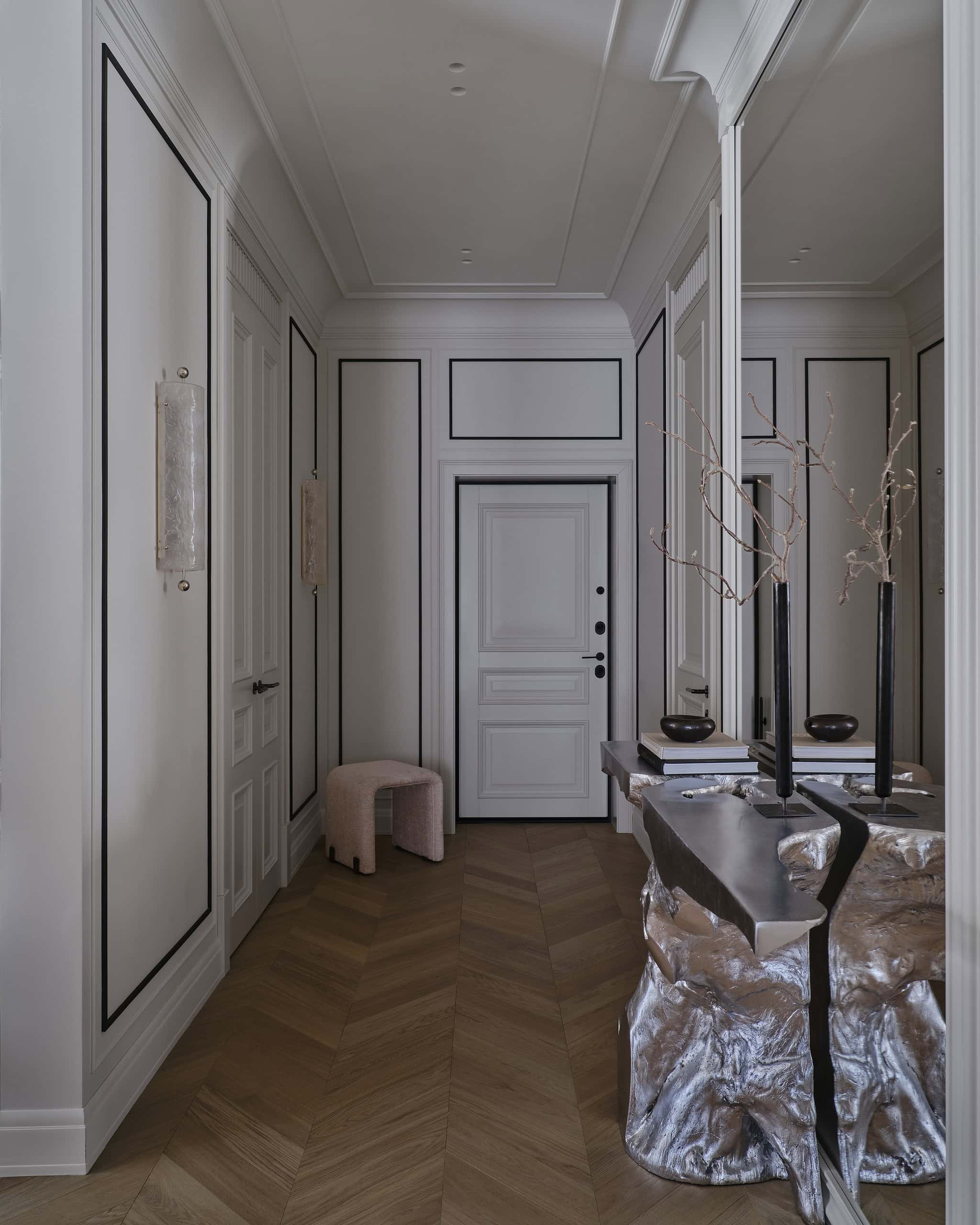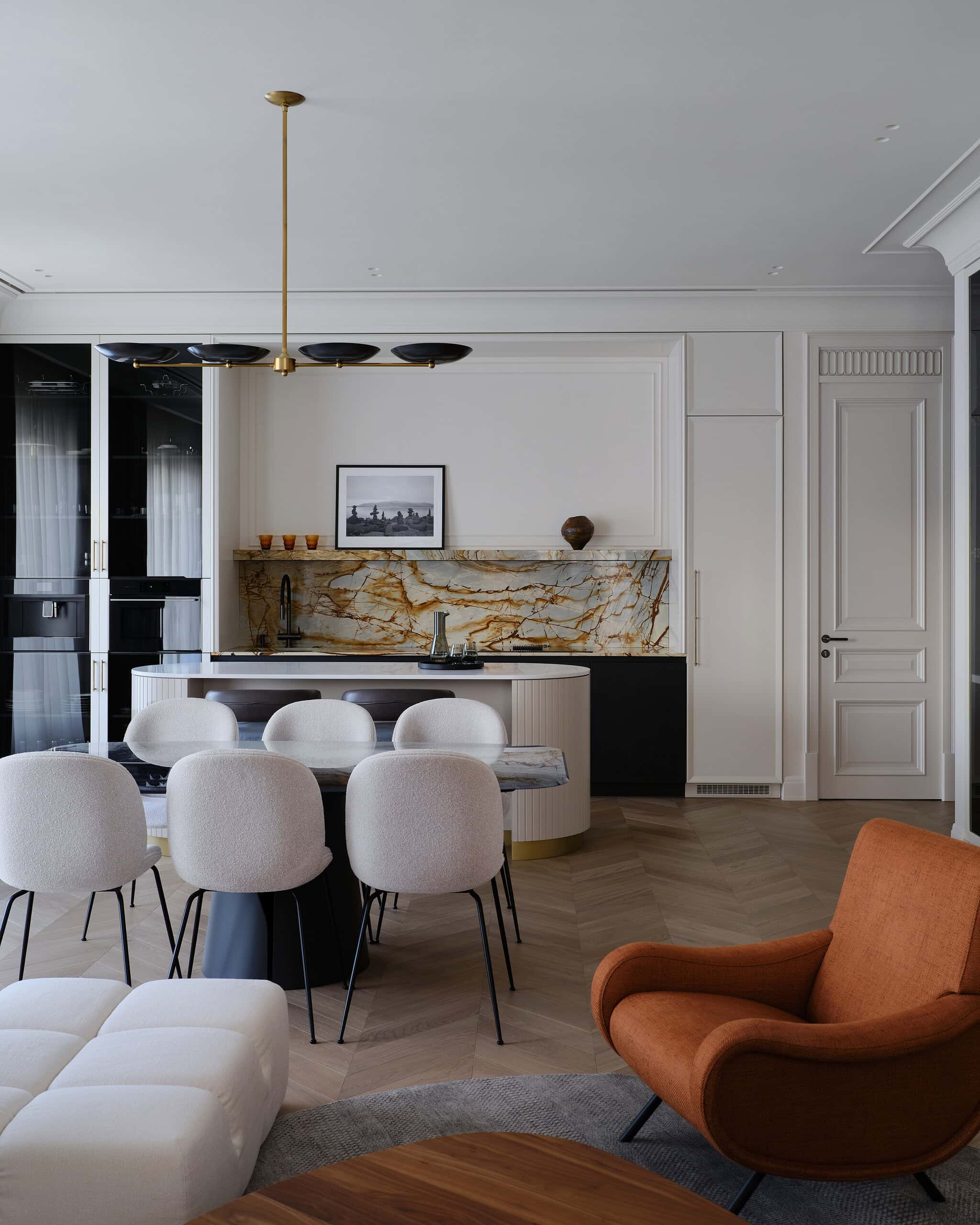 Lesya Pechenkina’s design for this Moscow apartment captures the timeless appeal of French classical design while embracing the practicality and warmth of American style. The result is a harmonious and bespoke space that offers both elegance and comfort, creating a home that feels both artistic and functional, perfectly suited to the needs of its inhabitants.