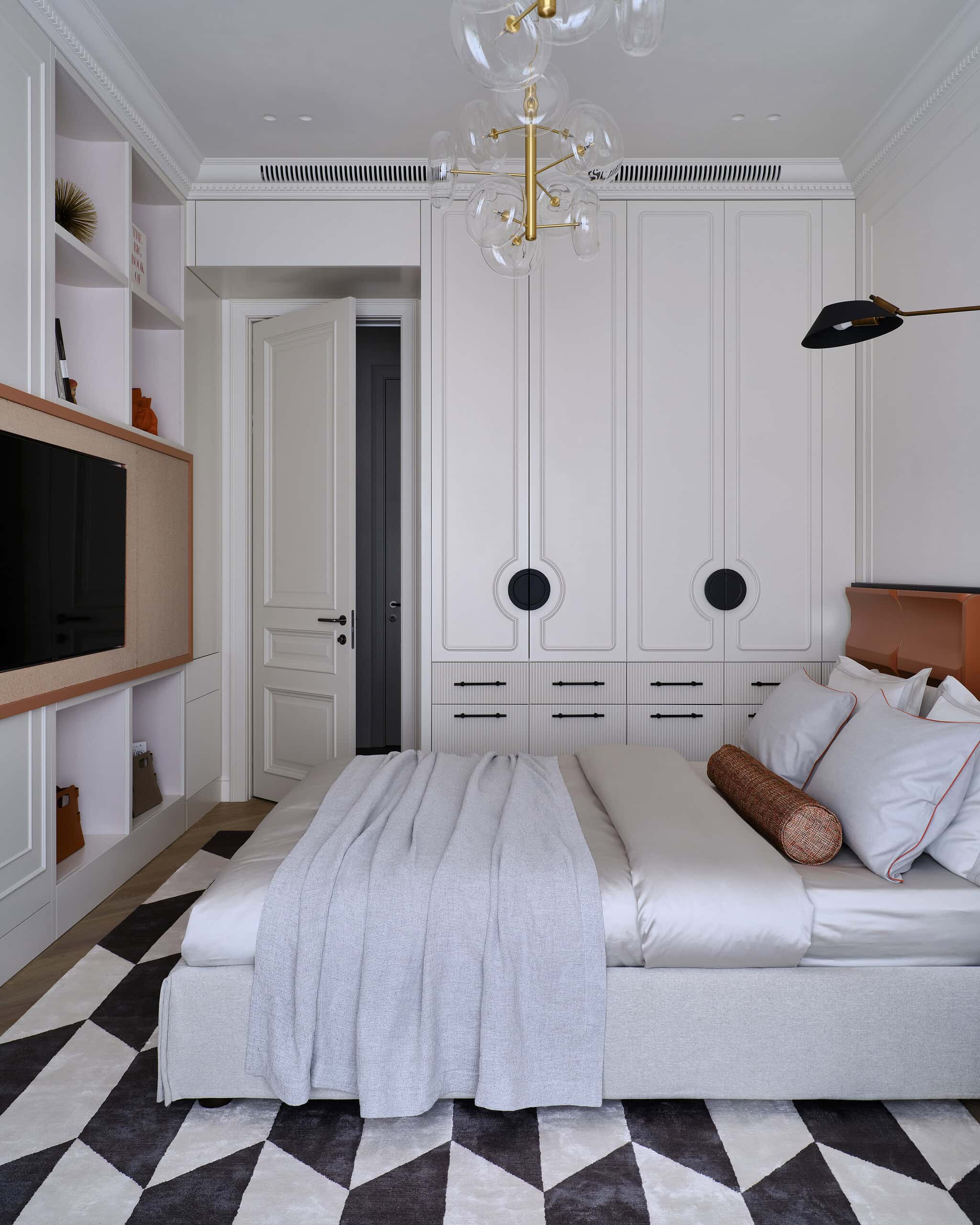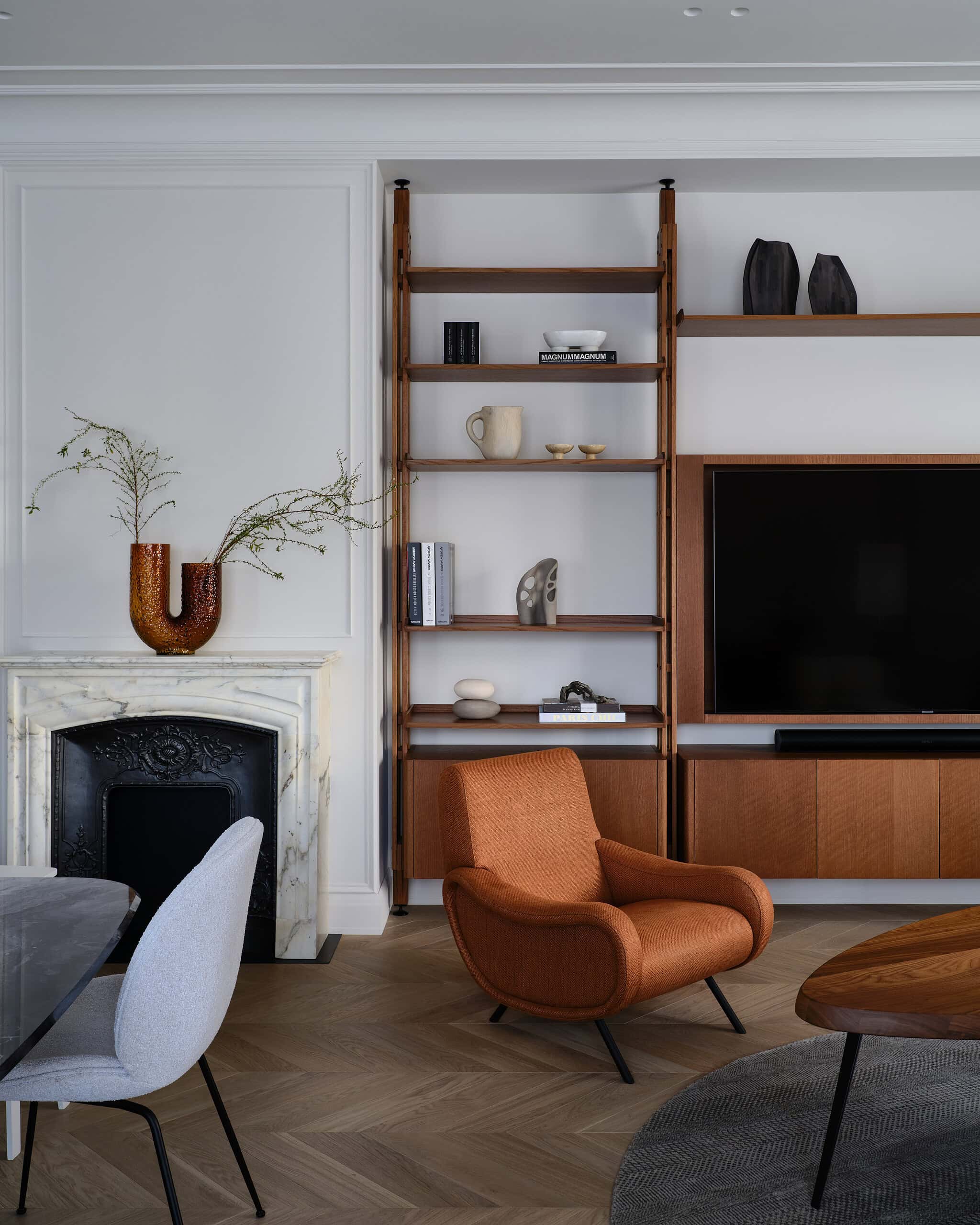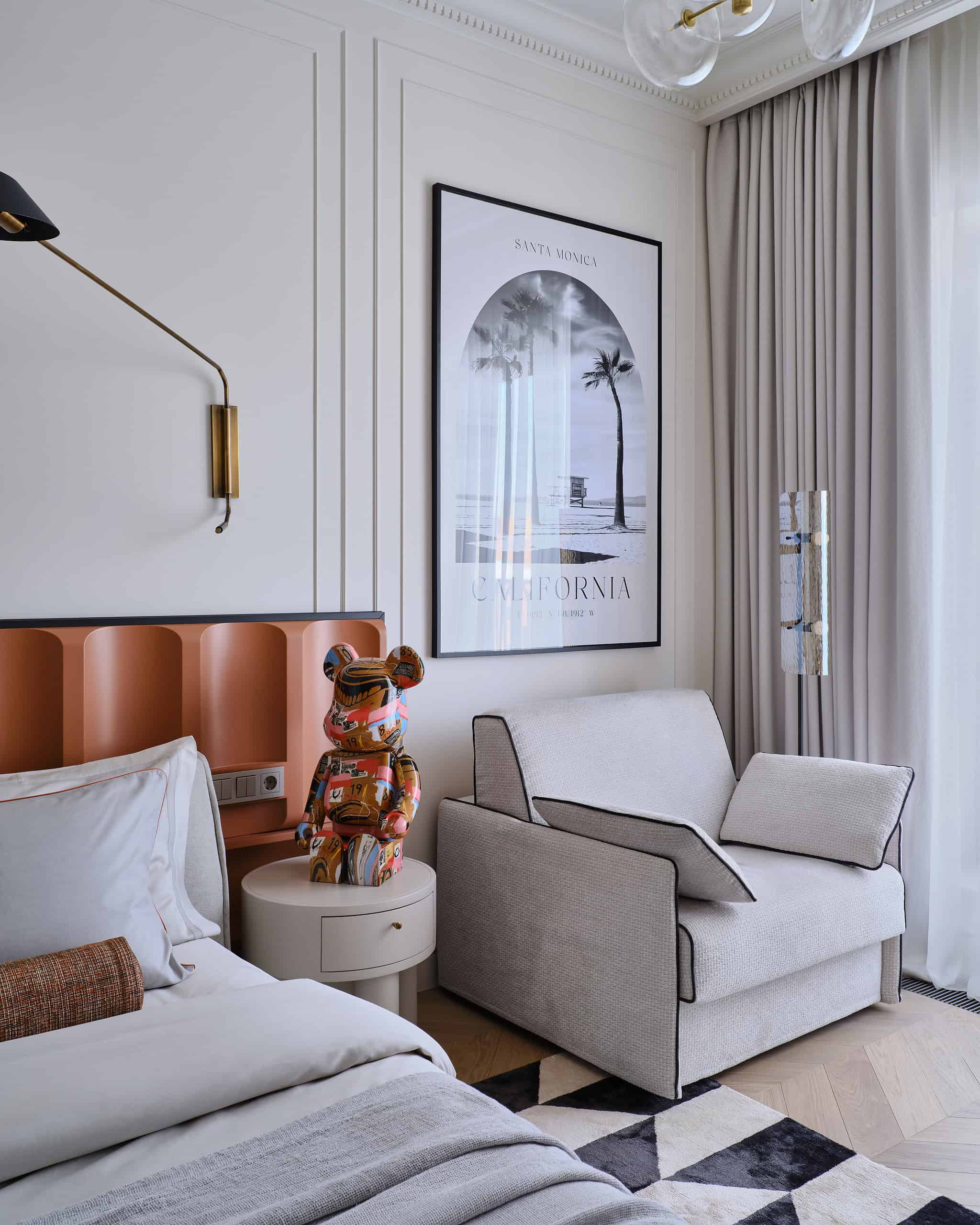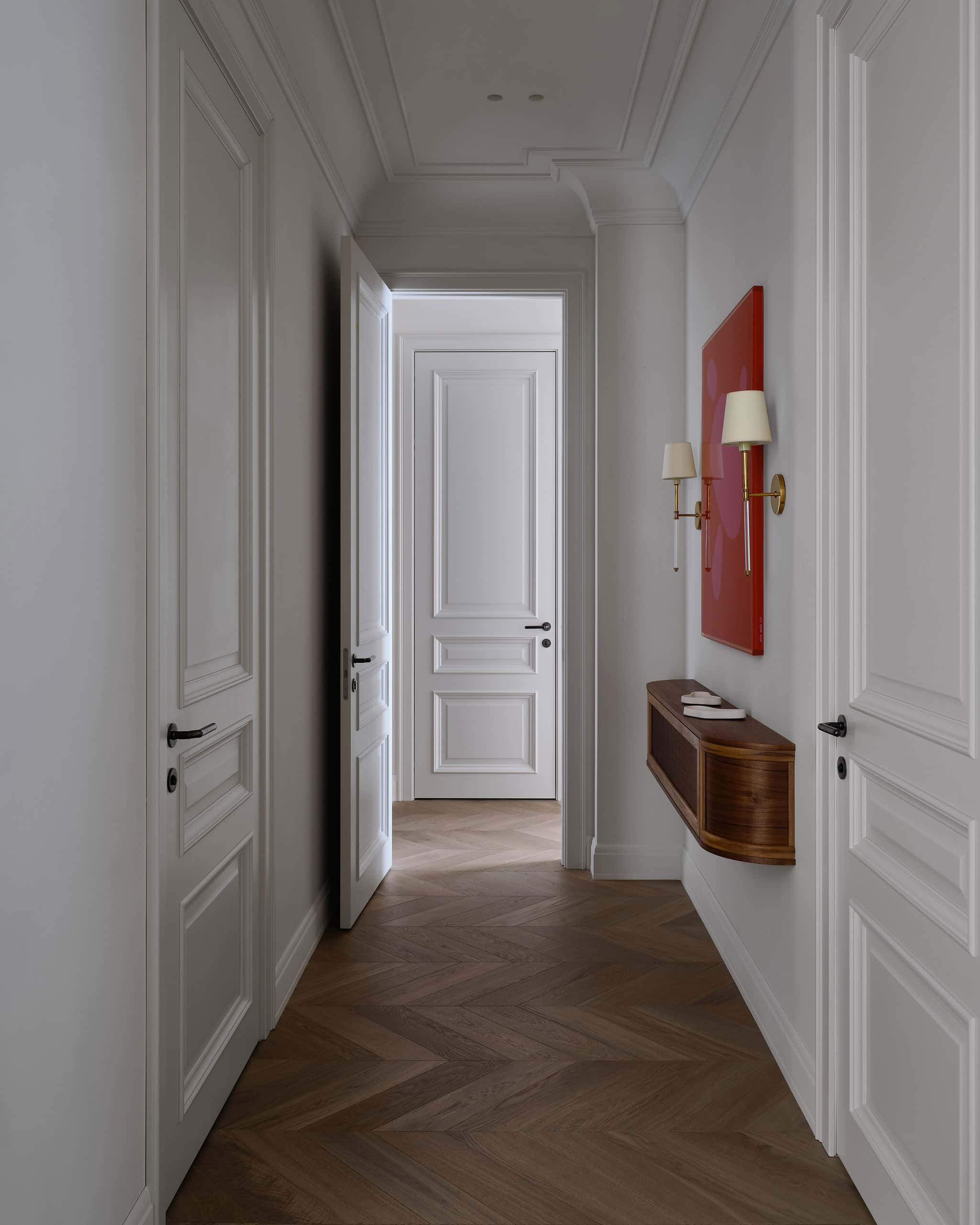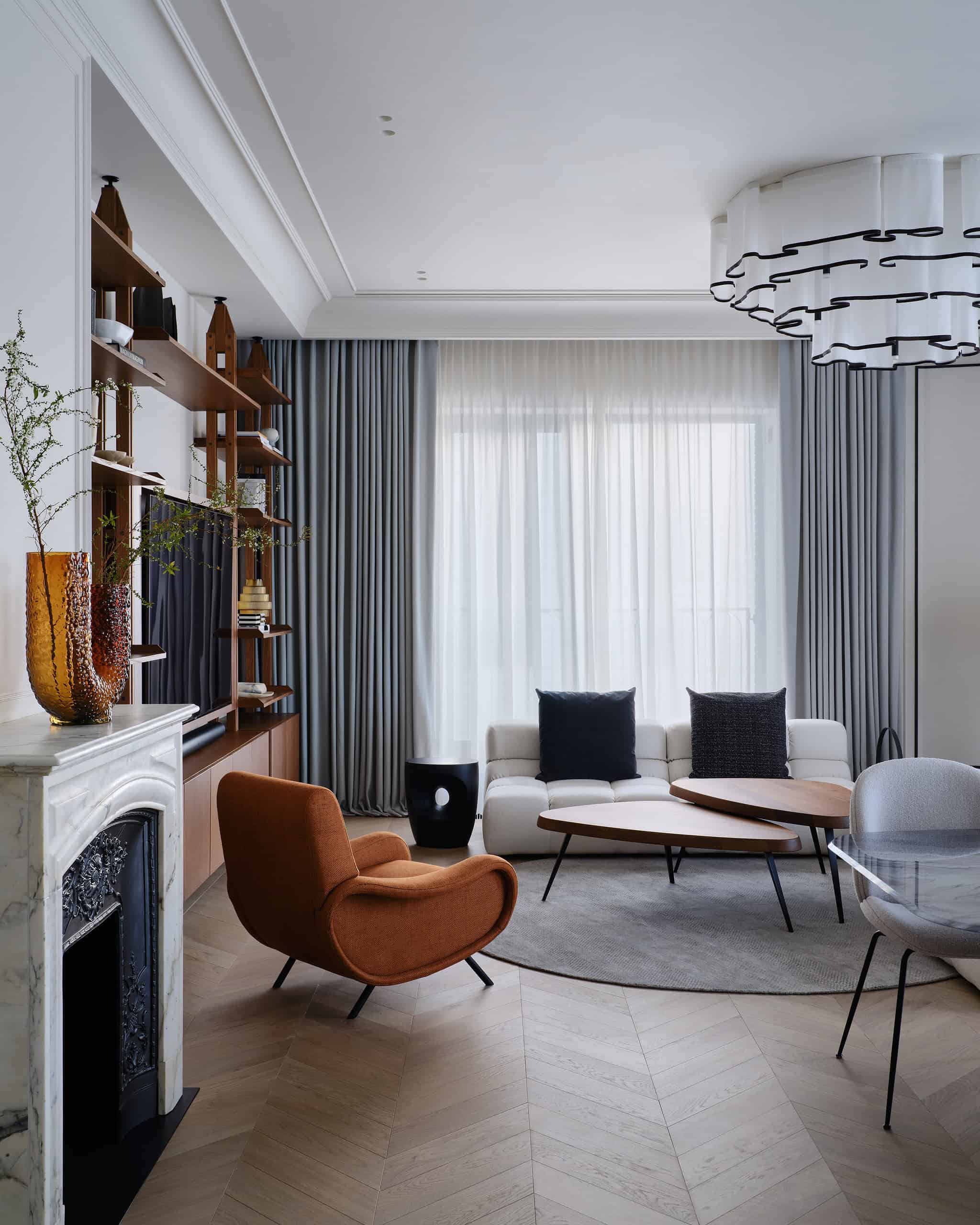 Lesya Pechenkina’s design for this Moscow apartment captures the timeless appeal of French classical design while embracing the practicality and warmth of American style. The result is a harmonious and bespoke space that offers both elegance and comfort, creating a home that feels both artistic and functional, perfectly suited to the needs of its inhabitants.
