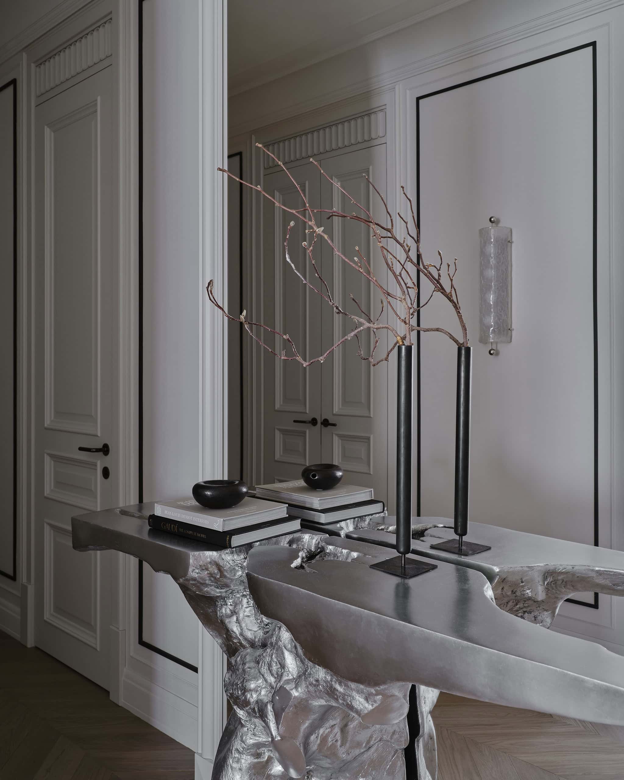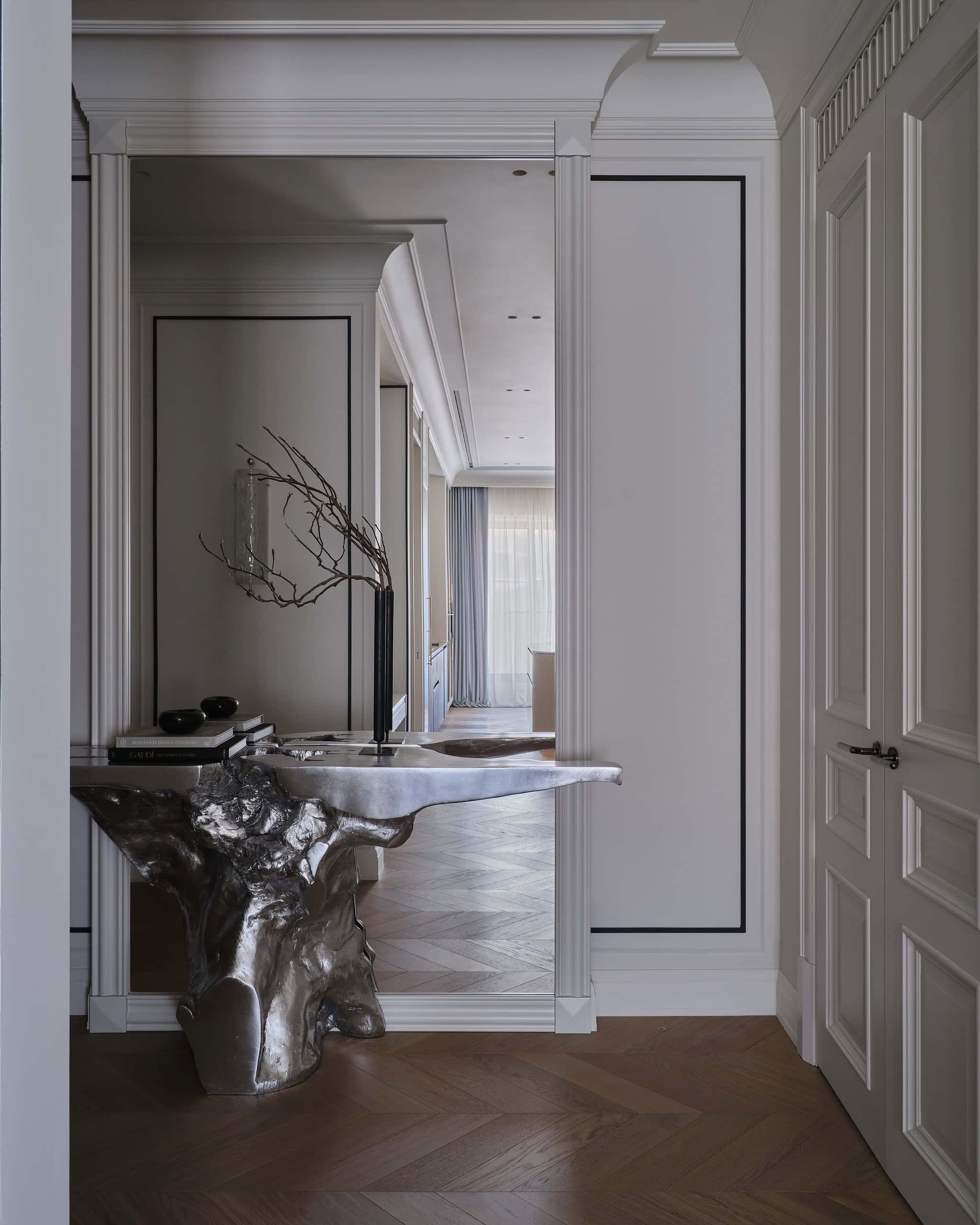 The entrance is marked by a striking console table from the Phillips Collection, resembling a silver-leafed tree trunk, and a large framed mirror. These elements create a grand first impression. The living room features a curved wall that complements a semicircular sofa and a round carpet, creating a sense of flow and harmony. A marble fireplace, imported from France, and a Blue Roma marble kitchen backsplash bring a touch of timeless elegance to the space.