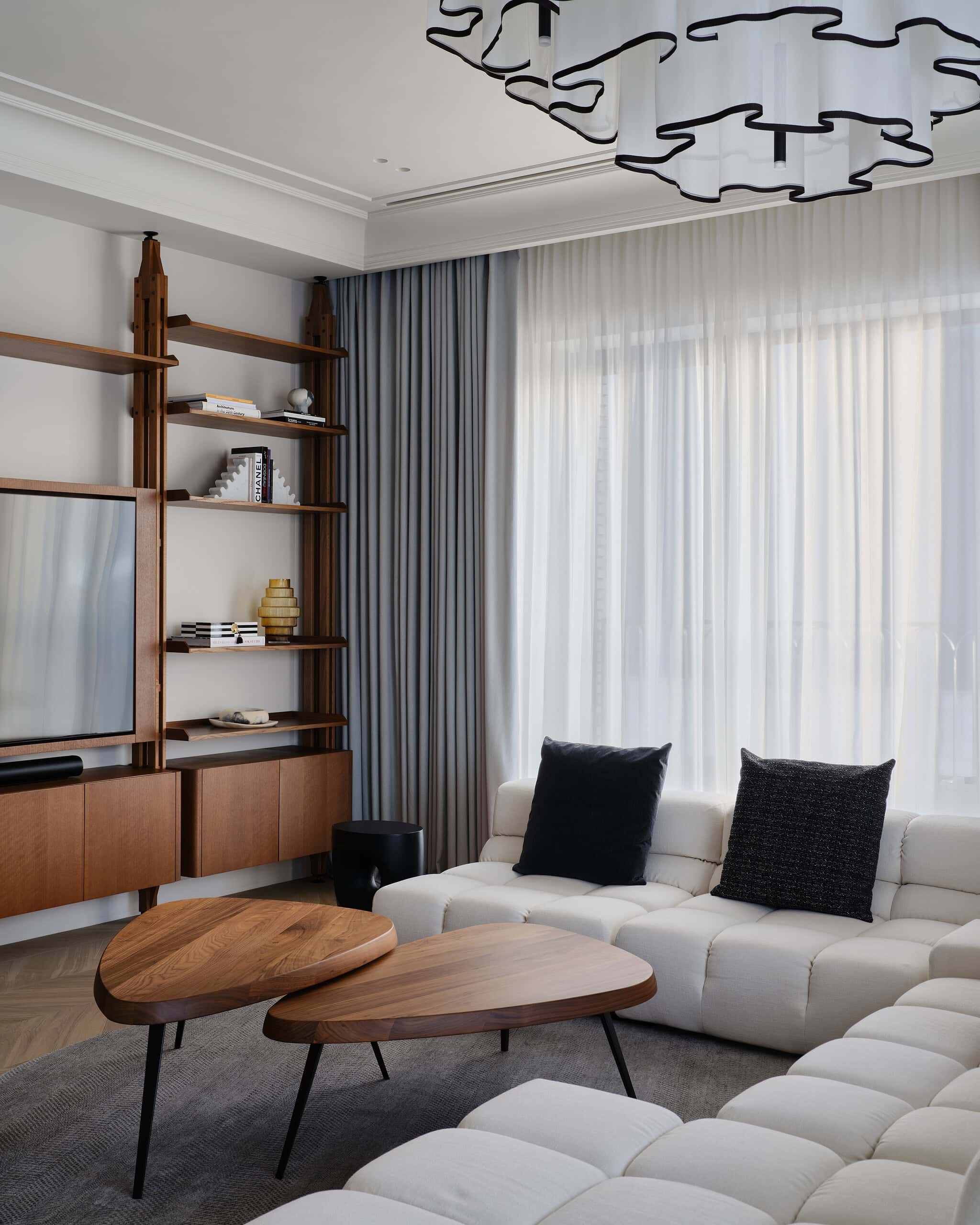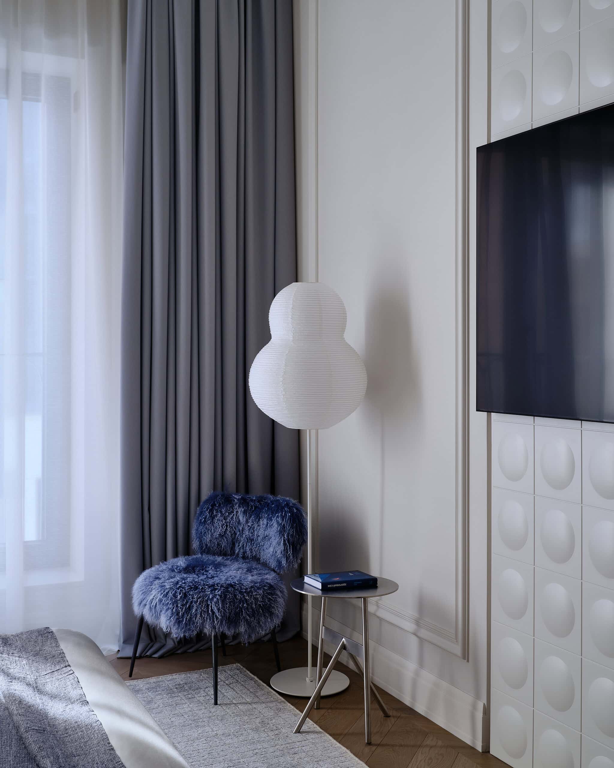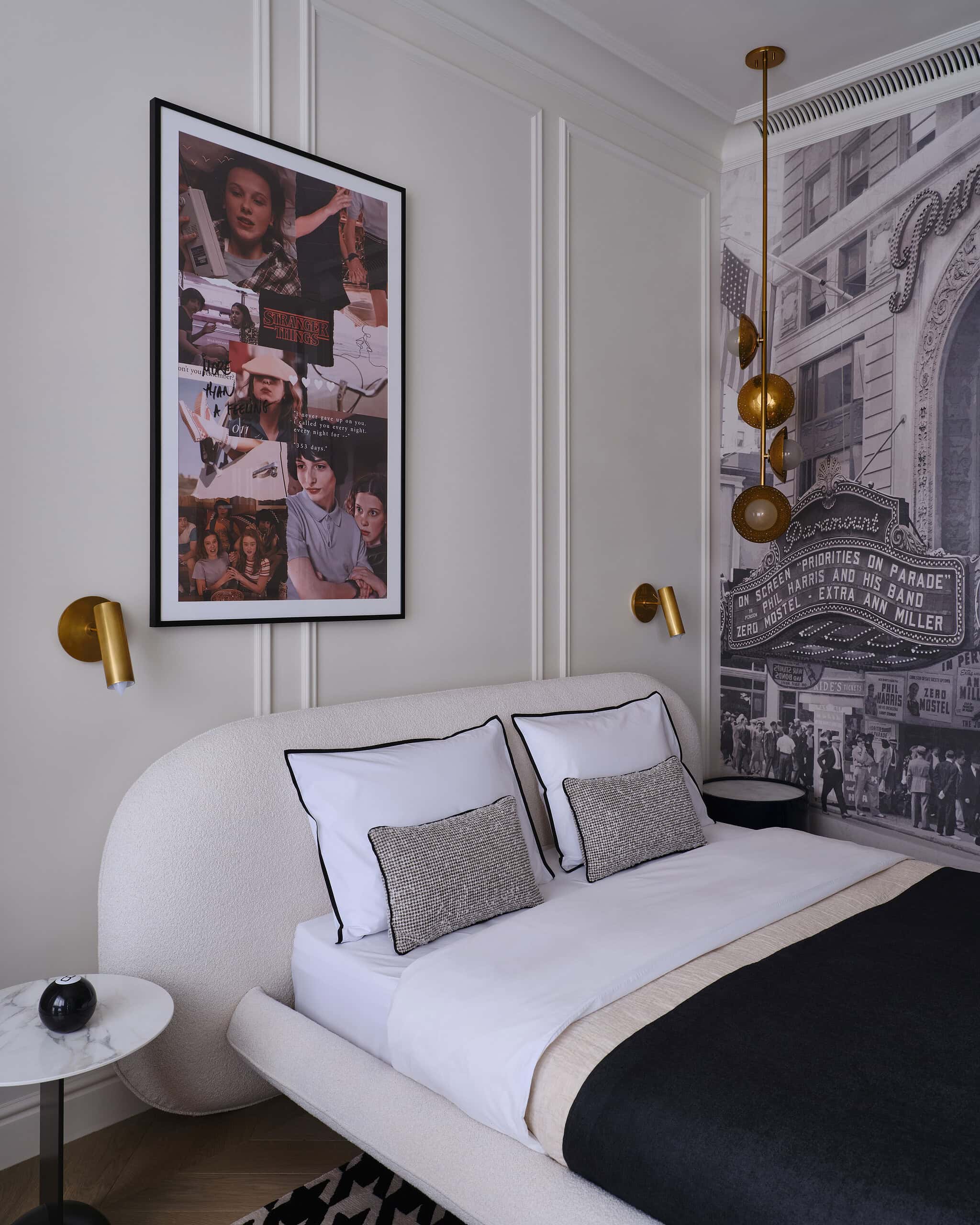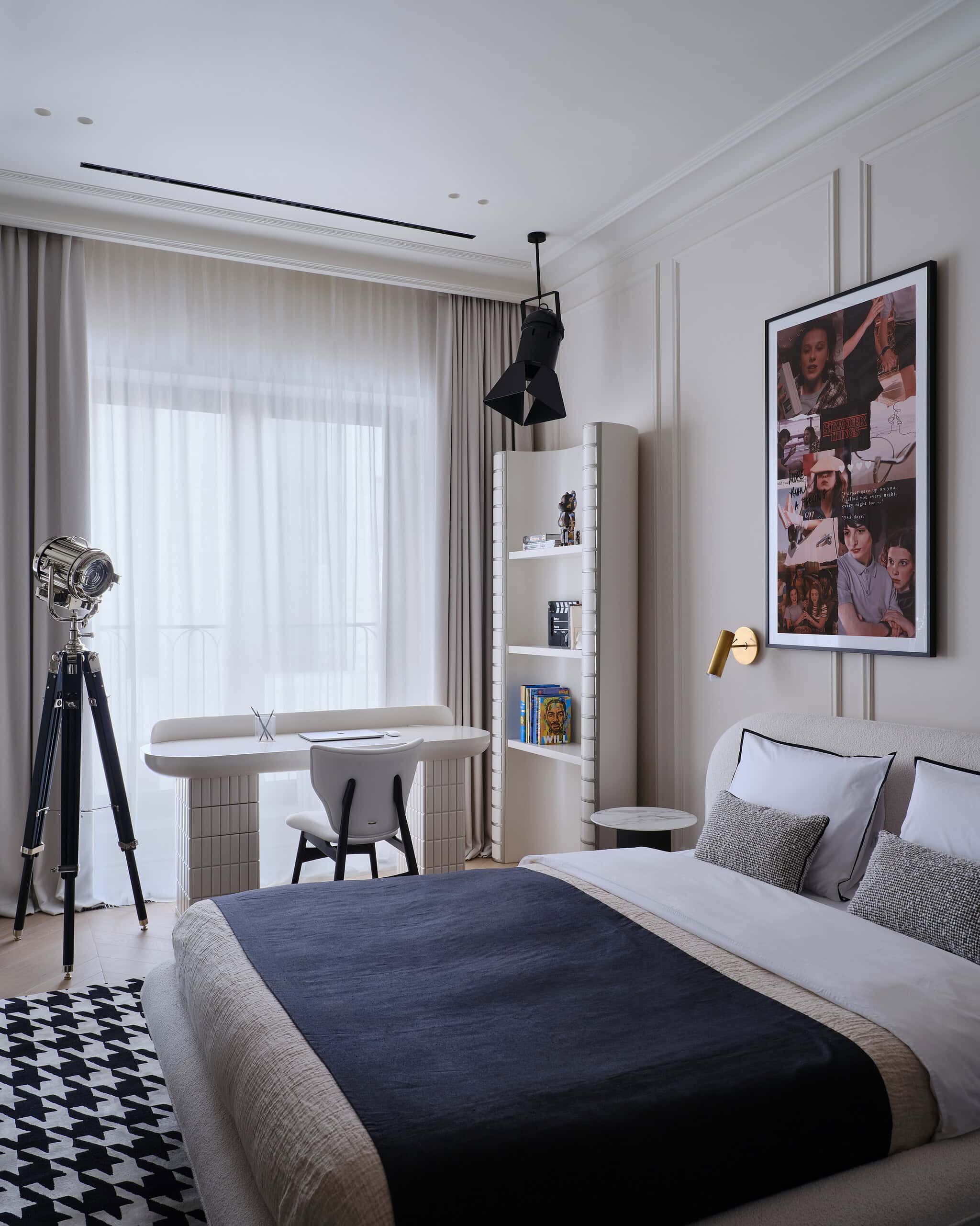 The design of the daughters’ bedrooms reflects their individual personalities and interests. The elder daughter’s room is inspired by her passion for cinema, with a Paramount Theatre panel, a film reel-shaped bookshelf, and a tripod floor lamp. Meanwhile, the younger daughter’s room is designed using caramel and graphite tones, with a chocolate bar-inspired panel behind the bed, adding a playful yet stylish touch.