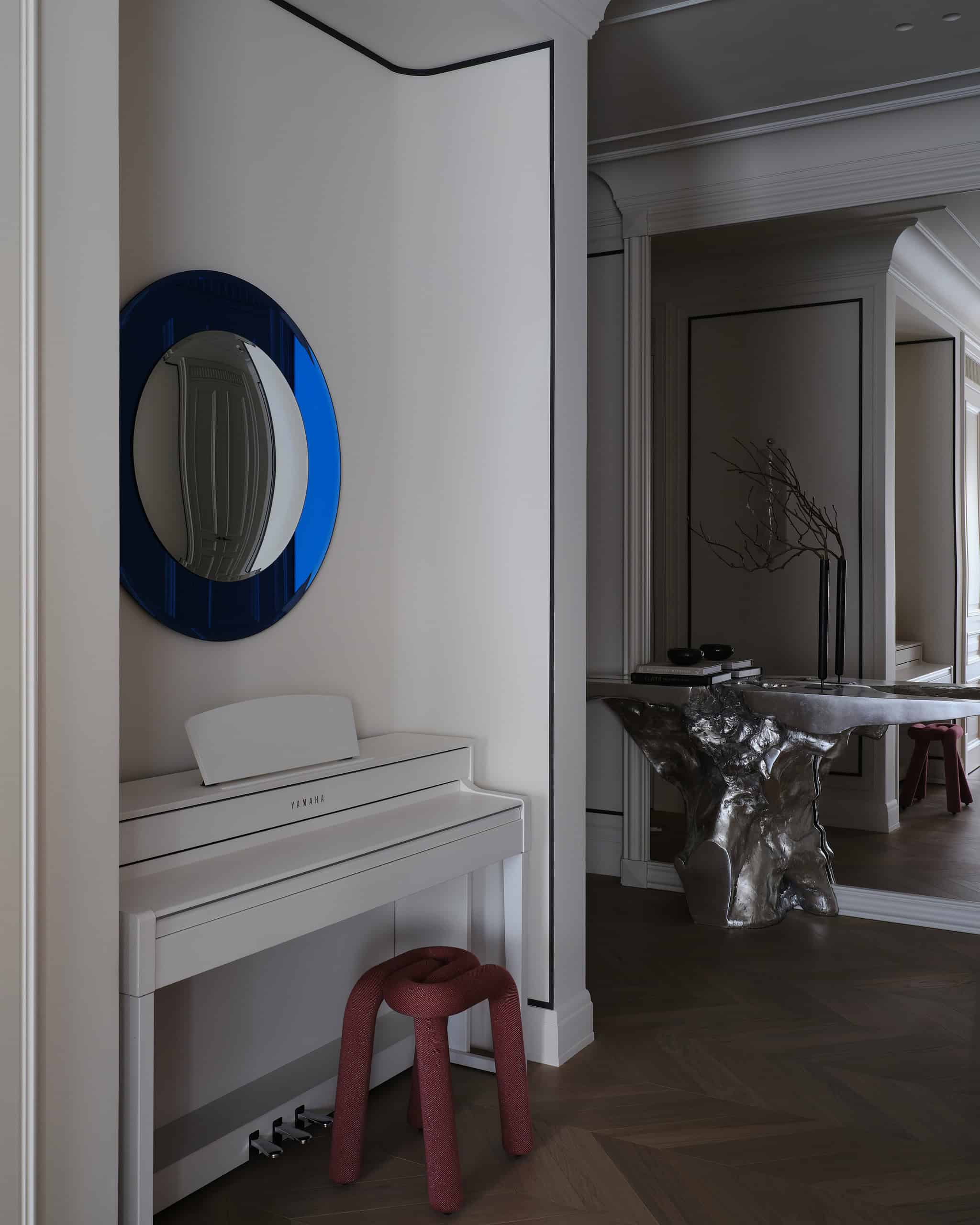 The design features an open-plan layout that merges three bedrooms, each with its own bathroom, a study, and generous communal spaces. The central element of the apartment is a combined living and dining area, where a piano takes center stage, symbolizing the family’s love for music. Bedrooms are thoughtfully separated by elegant double doors, offering privacy while maintaining visual continuity throughout the space.