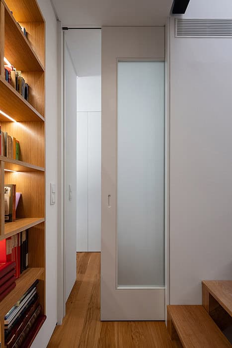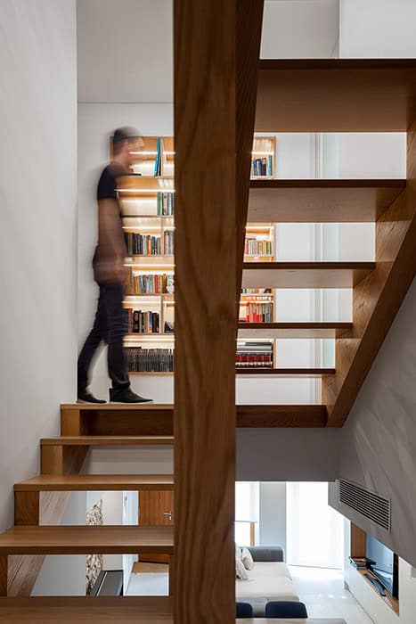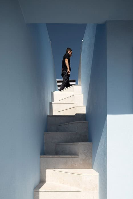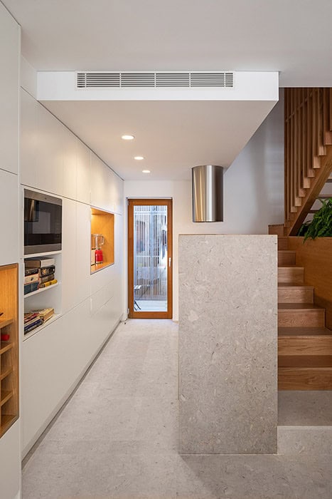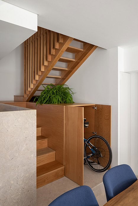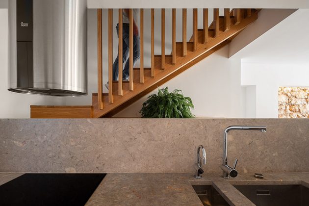 A central feature of GD House is its sculptural staircase, which connects three levels. Beginning as integrated furniture, it gradually dematerializes as it rises, becoming more permeable and transparent. This allows light to filter through, creating a stronger connection between floors while optimizing the use of vertical space.