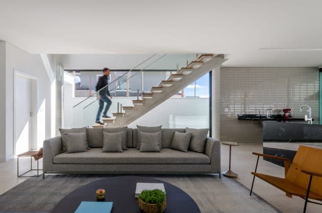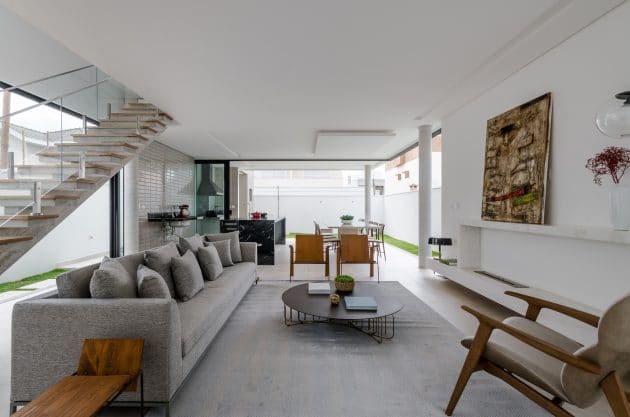 Exploring a contemporary rereading of modern designs, the house has apparent concrete on the stair structure and ground floor pillars. Living, TV and fireplace rooms all communicate with the kitchen, spontaneously and barrier-free, which, in turn, houses a supporting countertop and the cooking space. It can also be used for a quick meal, and service, when receiving in the dining room, in constant interaction.