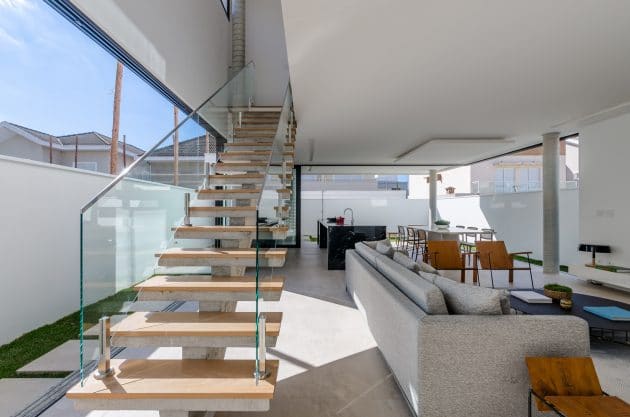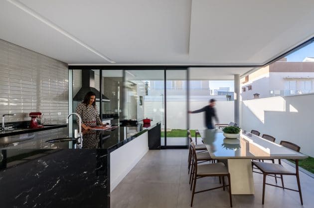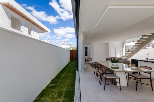 Due to the restrictions on land use, such as the delimitation of space by the obligatory minimum setbacks, on the sides and at the back, floor-to-ceiling glass frames were used on virtually the entire perimeter of the floor. When fully opened, they hide in the walls, fully integrating the entire environment and bringing fluidity, which ensures adequate insolation and constant cross ventilation, characteristic of the project. They also promote a sense of spaciousness and total occupation of the land, where the boundaries of the residence are that of the plot. There is no distinction between interior and exterior: the glass walls make the limits disappear, unnoticed, allowing full visual communication and abundant natural lighting. When needed, the use of curtains ensures residents’ privacy.
