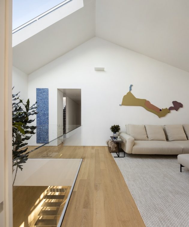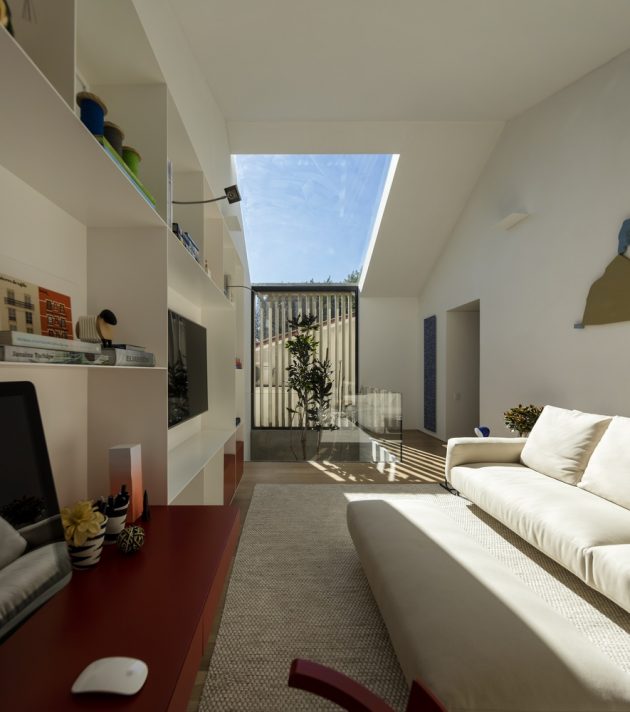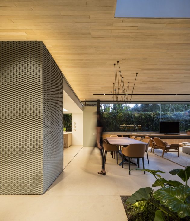The upper bulk hosts the private area of the house, composed by three suites and a living room. In this block, it was elaborated the idea of full and empty, explored by the rips that emphasize the natural lighting influence during the day in the rooms. The interior garden, in the private room, brings the green to the interior of the house and provides privacy to the façade of the back, besides lighting, in a subtle manner, the living room.