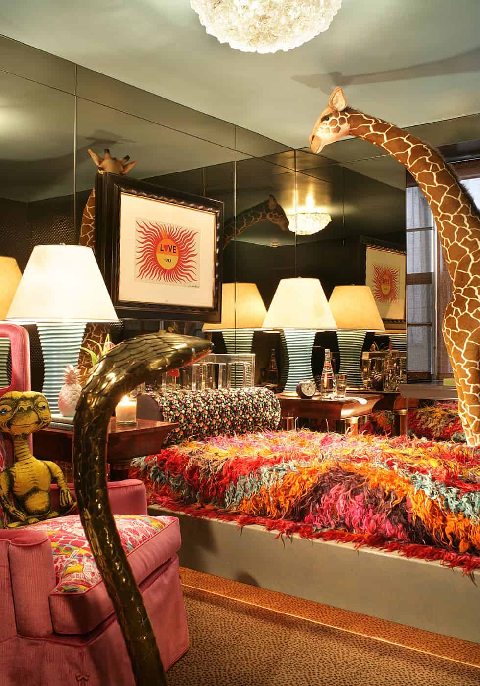 In the world of interior design, there is no shortage of camp and that’s for sure! Let’s start from Ken Fulk’s life-size black bear and giraffe-laden grand halls and staircases to Sasha Bikoff’s whimsical spaces, Jonathan Adler’s unabashed embrace of kitsch, etc.