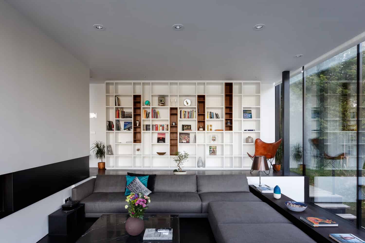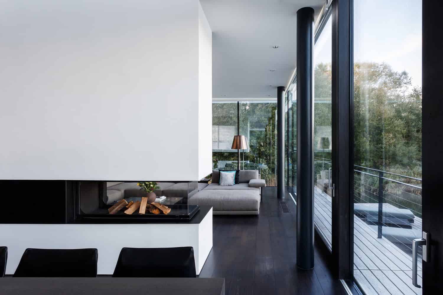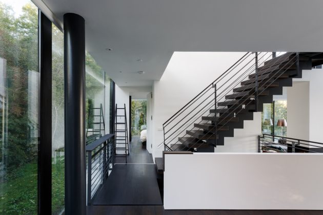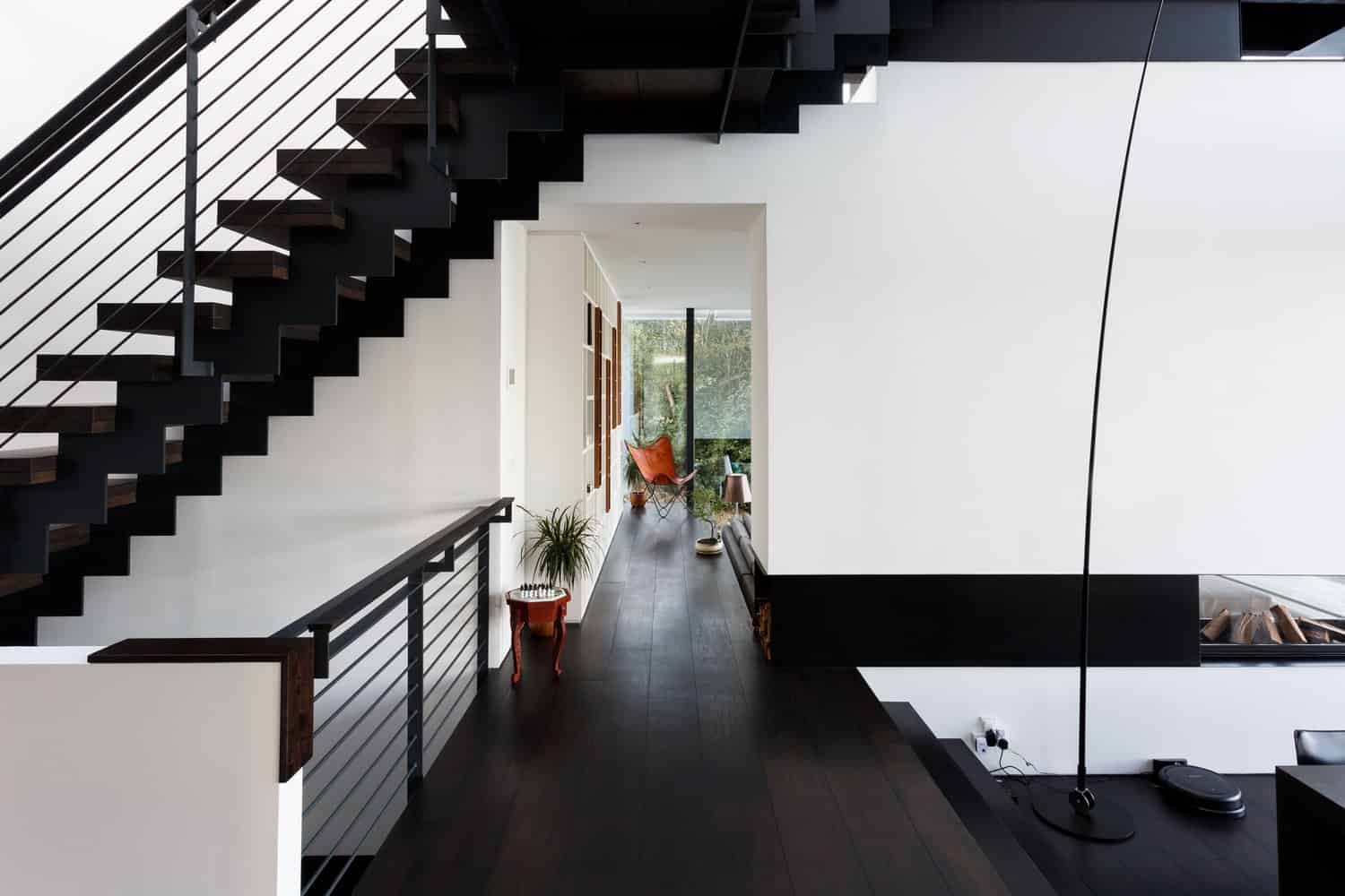 Interior elements such as the fireplace and storage cupboards, divide the house into different places, creating more intimate and private areas within the large transparent volume. In the heart of the house, a full-height void connects all levels and creates another series of diagonal and vertical sight lines.