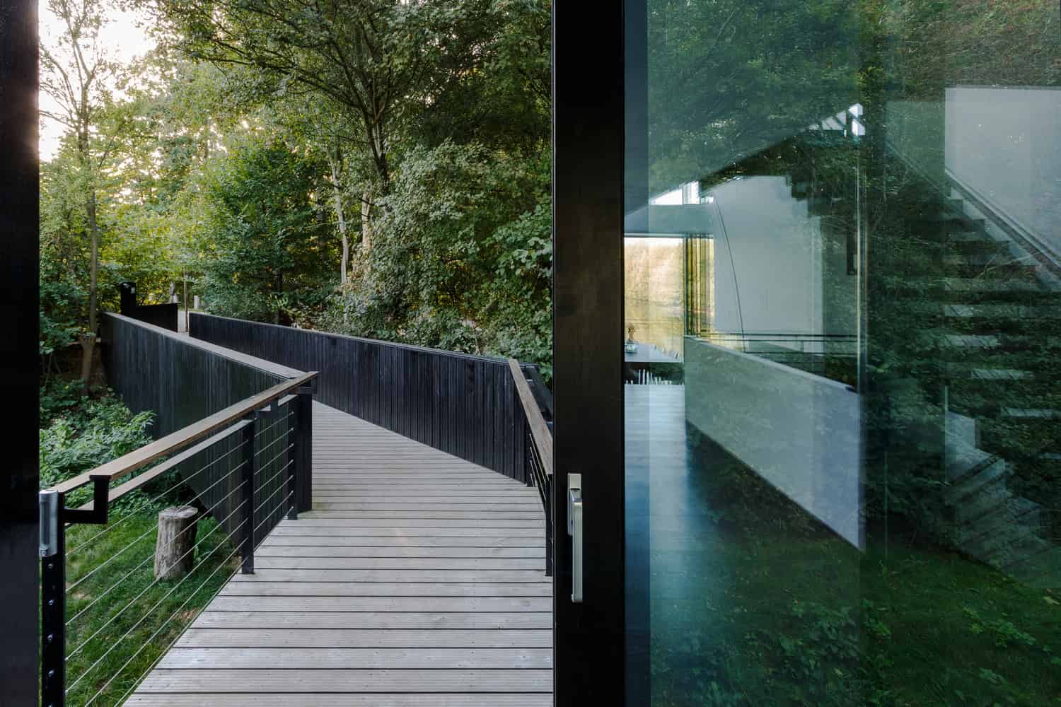 Water plants along the water line alternate with stepping stones that lead to other parts of the garden. On the water side, the villa has an optimal view over the lake. Terraces on two different levels connect the villa to both the land and the water, anchoring the house in nature and giving it a welcoming presence. Glass corner windows in the living room, kitchen and other rooms, make the residents feel like they live on the water. Between the house and the adjacent plot, a hilly finger of land with tall trees ensures privacy. By curving the bridge that connects the villa to the main road, the row of trees remains intact. This further increases the sense of privacy and blocks disturbing lights from the traffic.