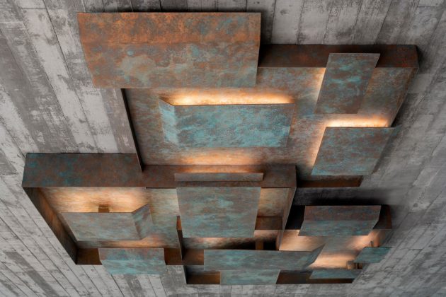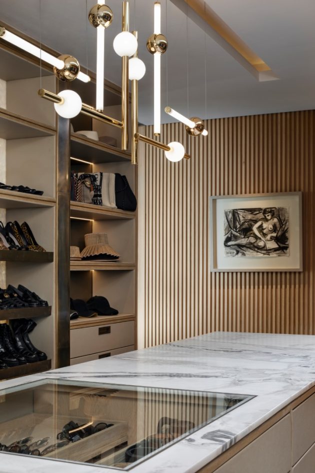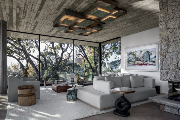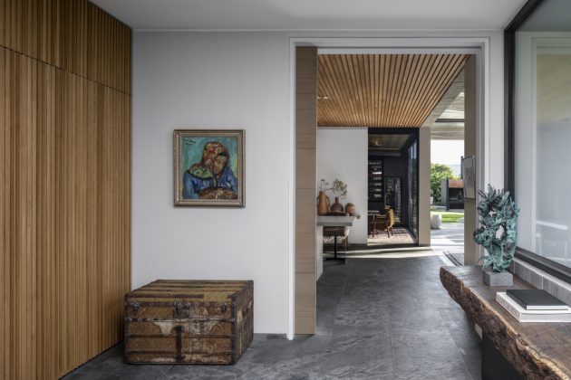 One of the interior highlights is the wine room, where ebonized oak, a gold-leaf ceiling, and bronze lighting combine to create a shimmering jewel box that contrasts with the villa’s more understated areas.