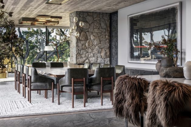 • Bespoke dining area anchored by a custom table by Martin Doller, integrated with lighting and greenery