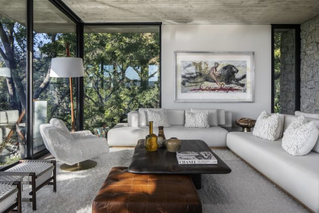 The most striking intervention by ARRCC is the creation of a new garden pavilion, which replaces a modest open structure. Cantilevered from the rocky slope and suspended among mature trees, this glass and stone pavilion blurs the boundary between interior comfort and the rugged mountainside setting.