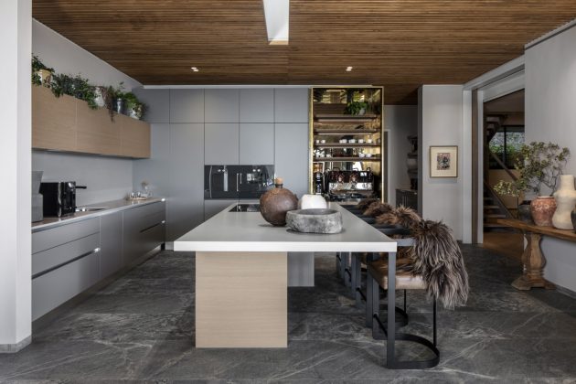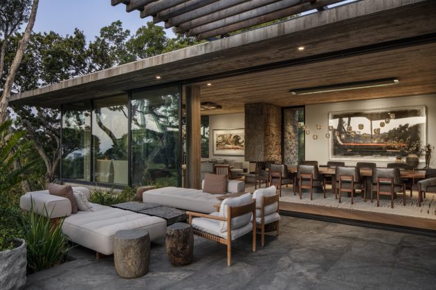 The garden pavilion and fire boma connect seamlessly with the terraced lawn, while carefully placed openings throughout the home frame Table Mountain and Cape Town city views. The architecture, interiors, and landscape work together to immerse the inhabitants in nature without sacrificing privacy or comfort.