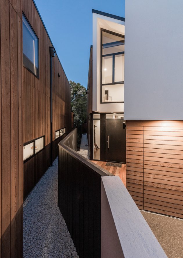 The dwellings are slightly offset, giving each home the ability to receive an abundance of natural light without compromising privacy to the living and private spaces.