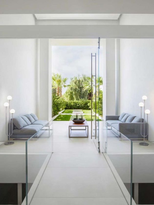 A defining architectural language of intersecting horizontal and vertical planes—rendered in crisp white finishes—evokes timeless minimalism while acknowledging the climate-conscious traditions of southern Greece. The building’s geometry and scale maintain classical balance while asserting a modernist presence along the coast.