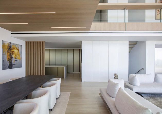 Upstairs, bedroom suites flank the central void, with sliding panels allowing privacy or openness depending on use. The spatial configuration allows the penthouse to expand or contract, adapting effortlessly to its occupants’ needs.