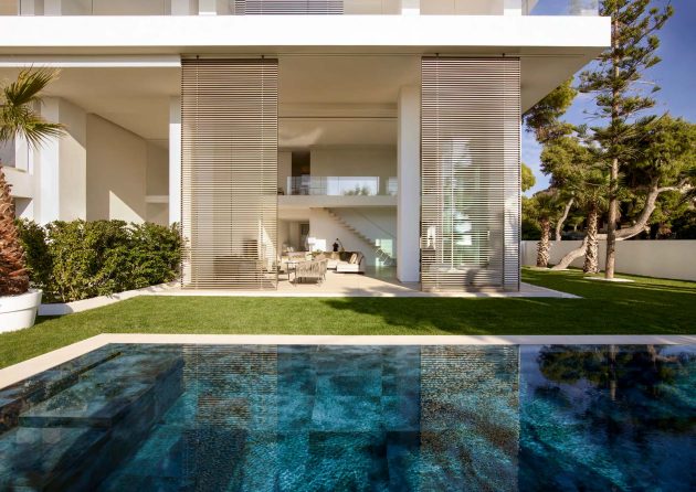 The expansive wraparound terrace is sheltered by a slender floating roof and anchored by a sunken swimming pool. Cantilevered pergolas define alfresco zones for dining and lounging. Carefully angled louvered screens ensure privacy without compromising the open coastal views, while glass balustrades maintain visual connection to the sea.