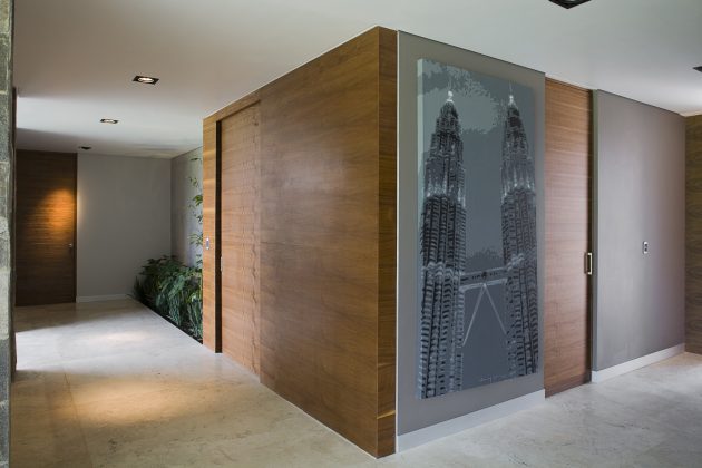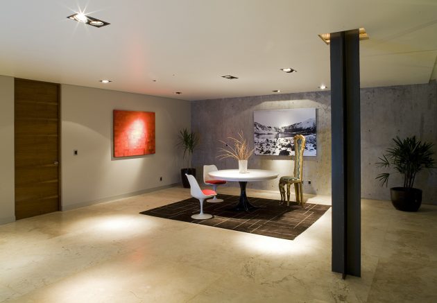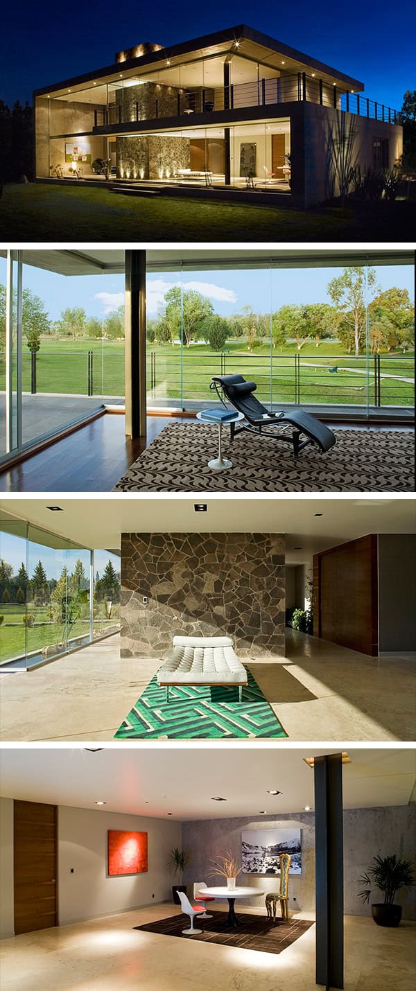 Even at the very first glance, this contemporary home gives away its geometric impression. Its design follows the minimalist principle with large open spaces and glass walls that flood the simplistic interior with light all day long.