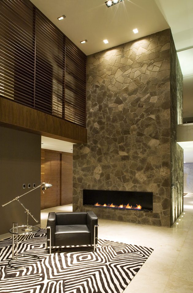 The use of natural materials, such as marble and stone for floors, predominates. Some walls were finished with these materials, some were finished in concrete and some were painted in neutral tones. To counter this, walnut was used for wall panels and doors, which offers warmth to the space. Some metallic elements are highlighted, like the cross-shaped columns and the railings, especially designed for this project.