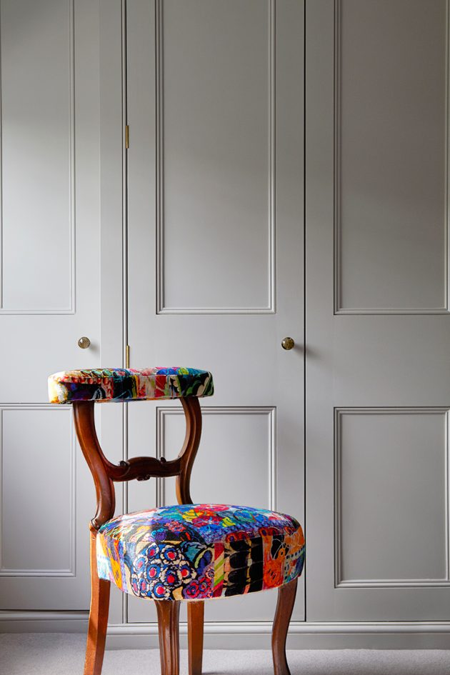We decided to inject light and colour to the property to create a vibrant, sophisticated family house; the scheme is sympathetic to the style of the house, yet modern and fresh. The use of strong, bold colours brought the dark sitting room to life, this was accented with bold contrasting bright colours and patterned velvet cushions. We love blending the old with the new and this worked particularly well in this property: we re-covered the old furniture, which was good quality and beautifully designed, they were given a new lease of life in vibrant, modern fabrics. We mixed the period features with more contemporary materials including glass and plastics. The bedside tables in the master bedroom in black plastic are an unexpected choice , yet work so well in the room and offer a practical solution. We also sourced a selection of interesting table lamps throughout the house and not to mention some quirky accessories too.