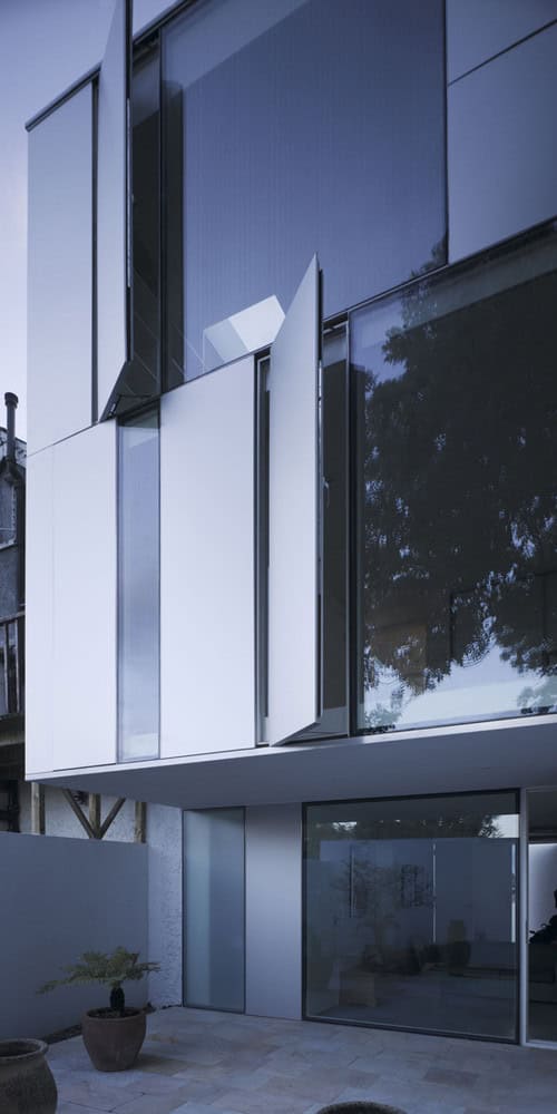 The break up of the the buildings main elements, defined in elevation by the horizontal structural lines, help to identify the structure and functions contained behind. The building profile is further strengthened with a deliberately weighted treatment to the openings at first and ground floor level adding to the aura of secrecy as to what’s contained within. An external terrace area has been provided at the front section of the upper floor, increasing the visual and physical depth of the open plan living accommodation.