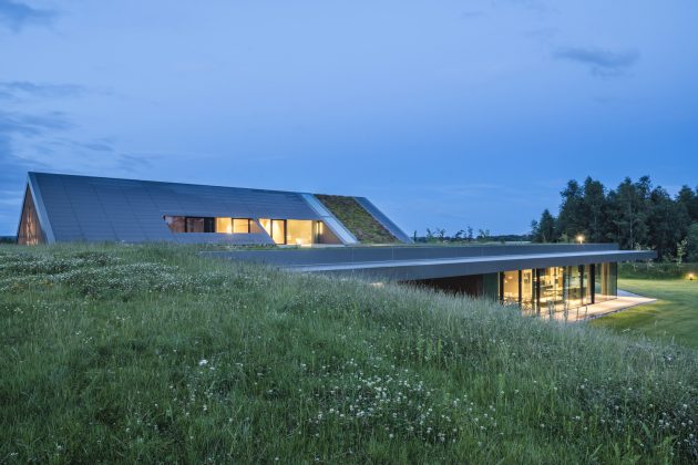 A detail of the roof part is a vertical skylight, which asymmetrically divides the slope by opening the interior of the private zone to the surroundings. The roof of the building is mostly covered with grass. Only from the side of open atrium concrete slabs were used. This is an aesthetic device designed to emphasize the modern nature of the building.