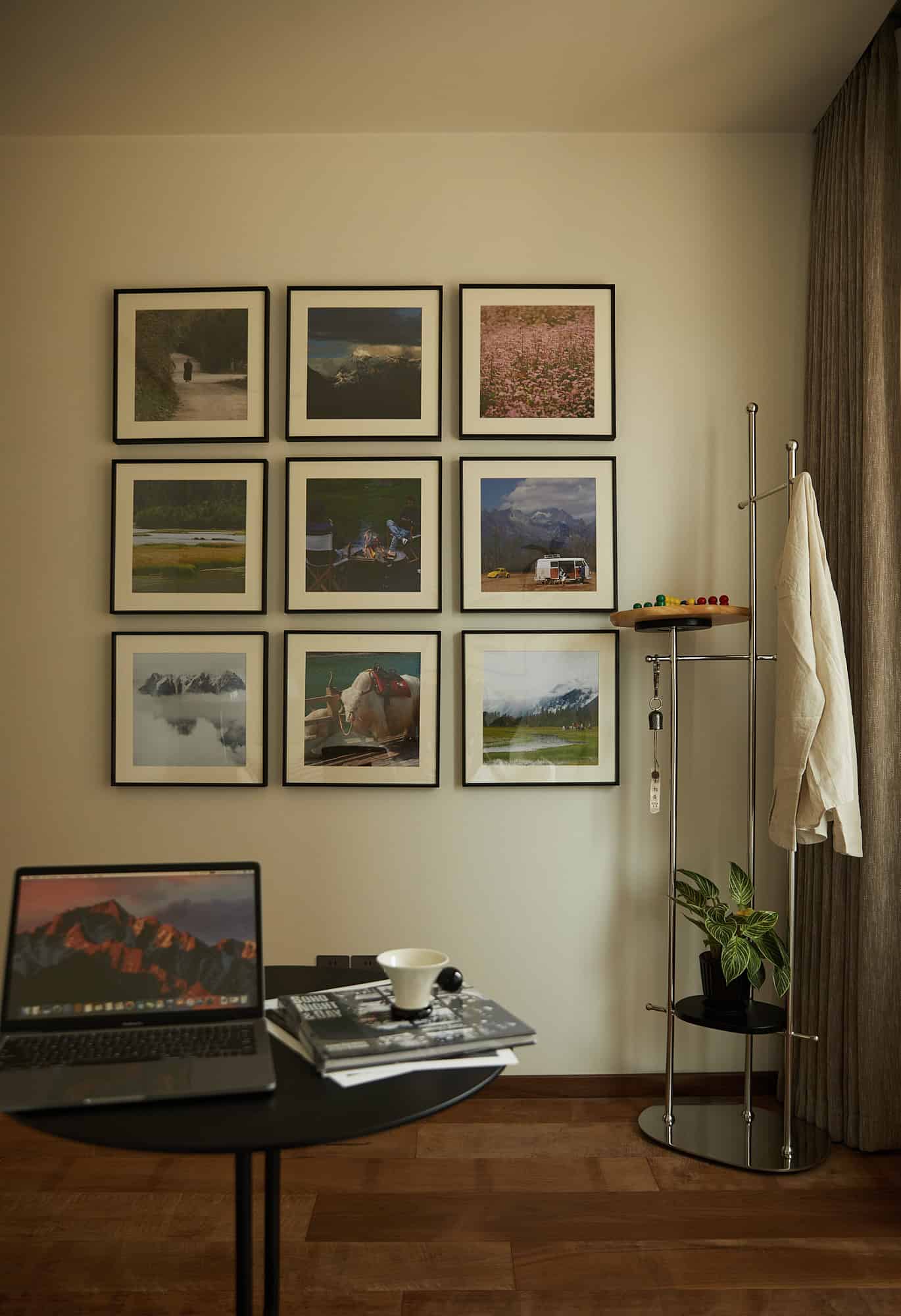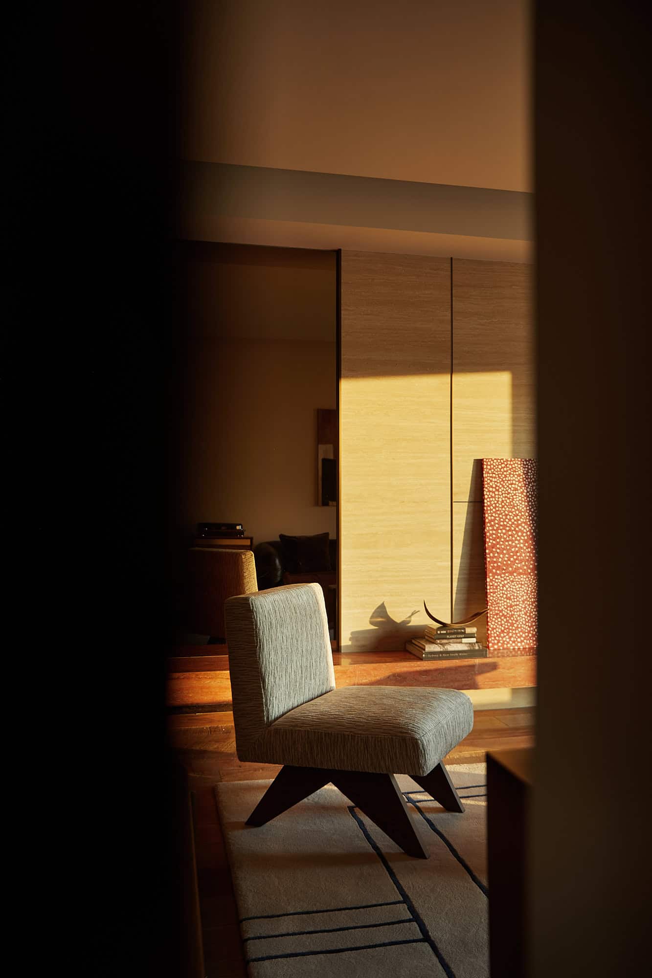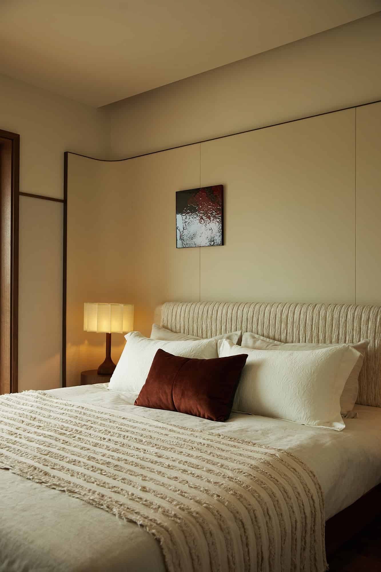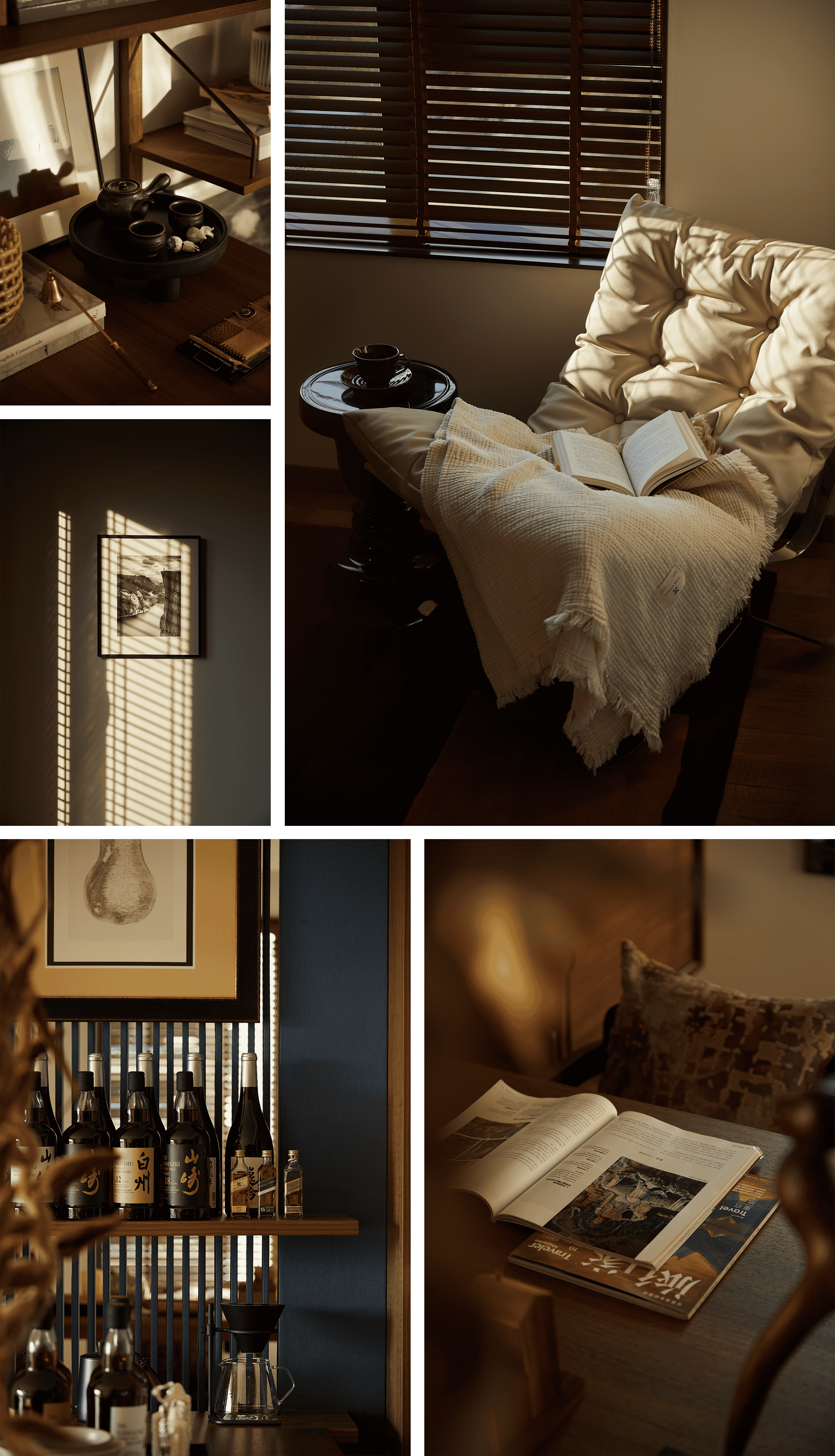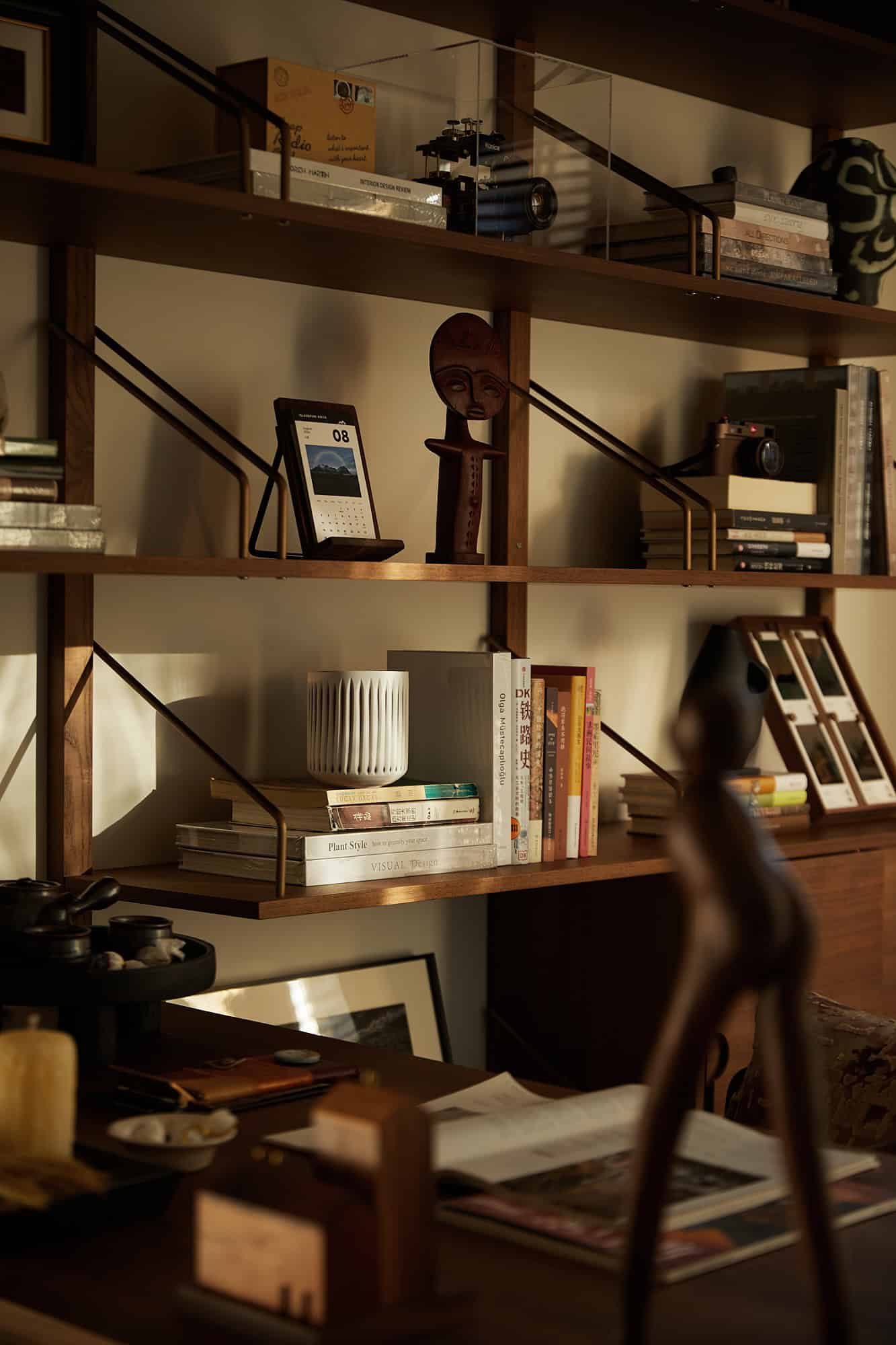 At the heart of the design is a celebration of light and texture. Panoramic windows allow sunlight to flood the interiors, casting shadows that add depth and movement to the space. The use of earthy tones, soft fabrics, and natural materials creates a warm, inviting atmosphere. The living room is anchored by rich chestnut hues and curated artworks. Light filters through, revealing subtle textures and creating a dynamic interplay of shadow and form. The open-plan layout encourages social interaction, with music, art, and personal collections contributing to an atmosphere of creativity and comfort. In the study, a lattice-style wine cabinet divides the space, offering privacy without sacrificing openness. This cozy nook, perfect for quiet reading or contemplation, is bathed in natural light, reinforcing the home’s connection to the outdoors. The bedroom, with its soft, natural materials like cotton-linen, velvet, and washi paper, evokes a sense of retreat. The space feels like a vacation escape, designed for relaxation and reconnection with nature. The multipurpose room serves various functions—a guest suite, hobby room, or home theater. The uncluttered design leaves room for personal expression and creativity.
