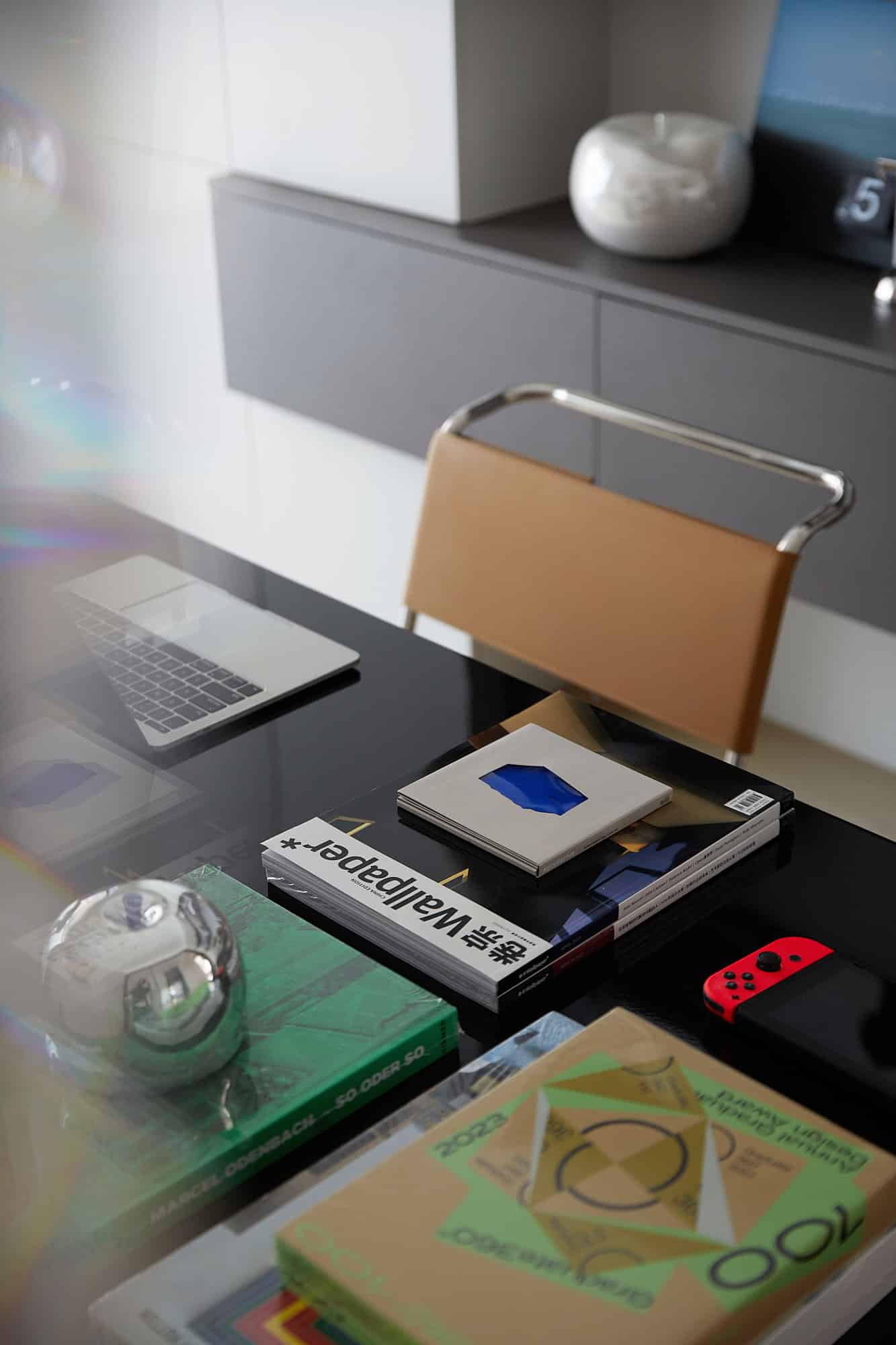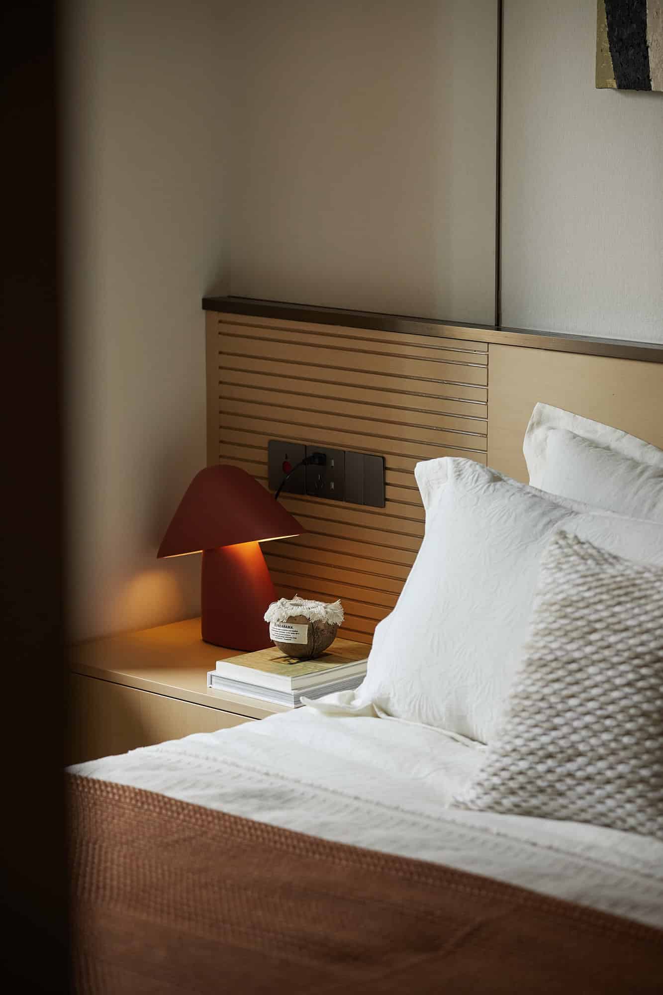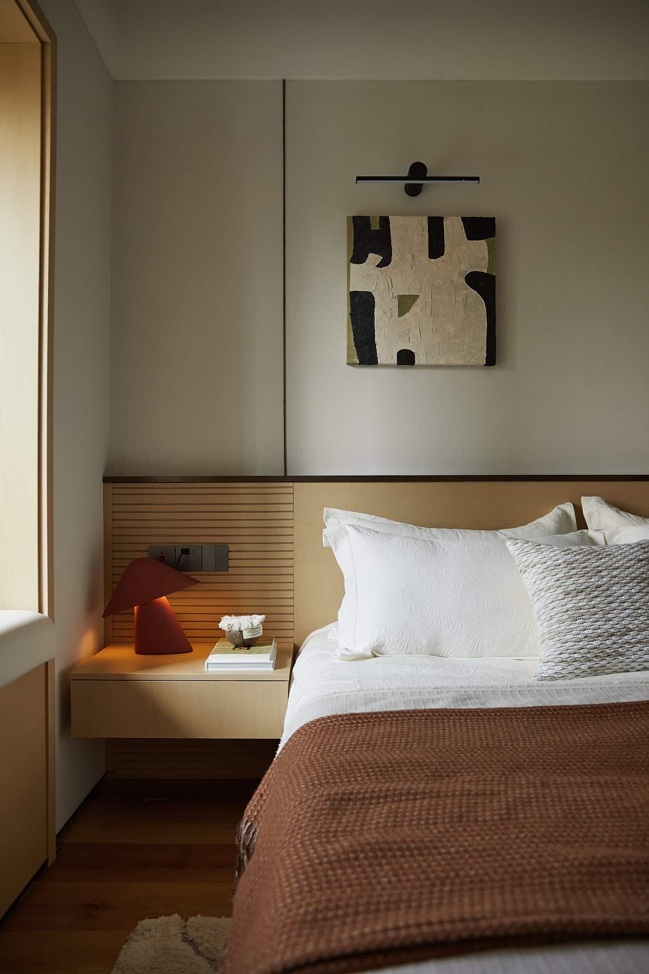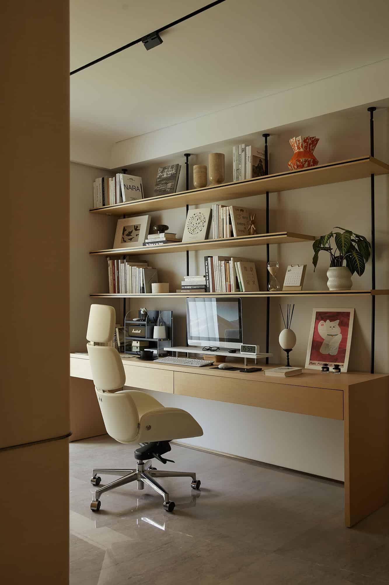 While the project embraces minimalism, WJ Studio introduces moments of boldness through color and custom furniture. These elements add energy and vibrancy, creating a dynamic contrast to the otherwise subdued palette. The dining area features a round, bean-green table and geometric blue artwork that create a striking visual balance, blending form and function. Custom-designed angular sofas and sculptural chairs make bold statements, reflecting modern design trends. The study’s sleek bookshelf showcases the homeowner’s collection of vinyl records, art pieces, and trendy toys, offering a glimpse into their personality. Rich, contrasting colors—red, green, black, and yellow—add warmth and depth in the master bedroom, creating a space that feels vibrant yet harmonious. The children’s room inspires creativity, with a playful mix of colors and interactive decor, making it both functional and fun.