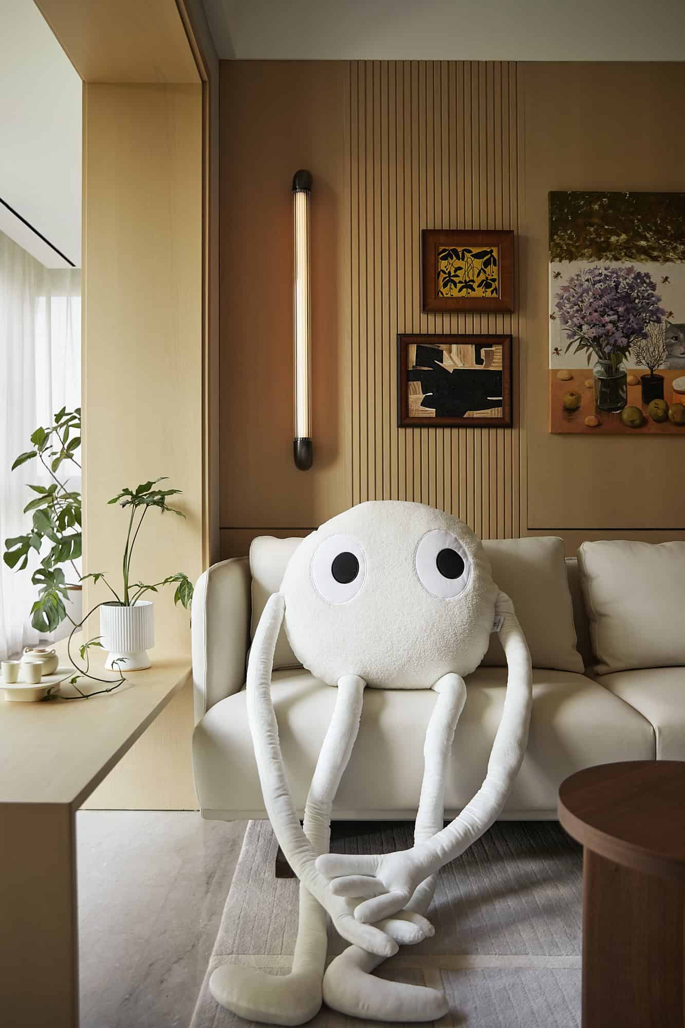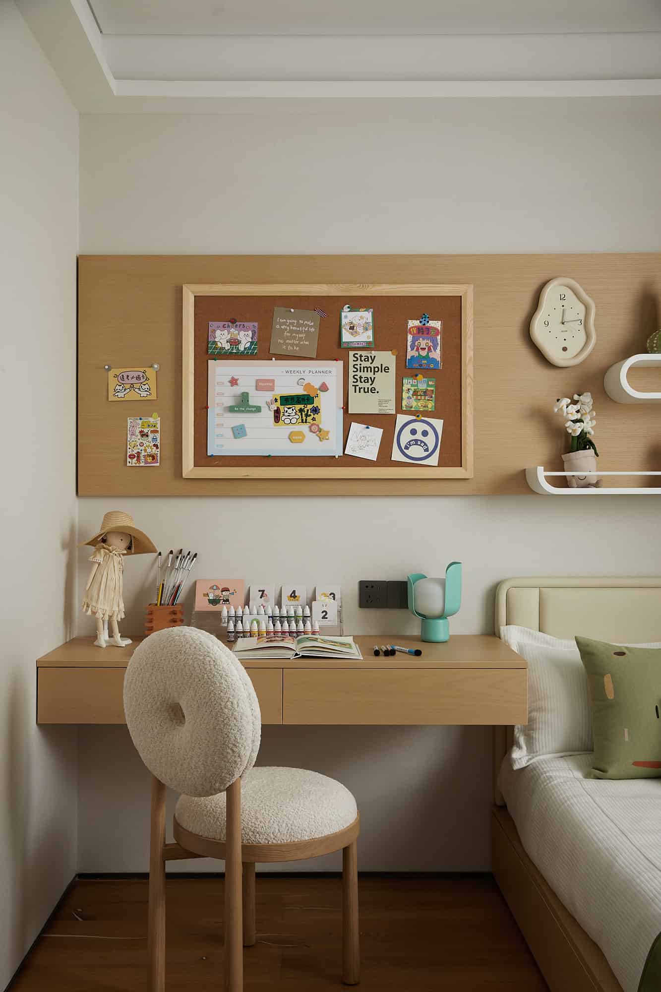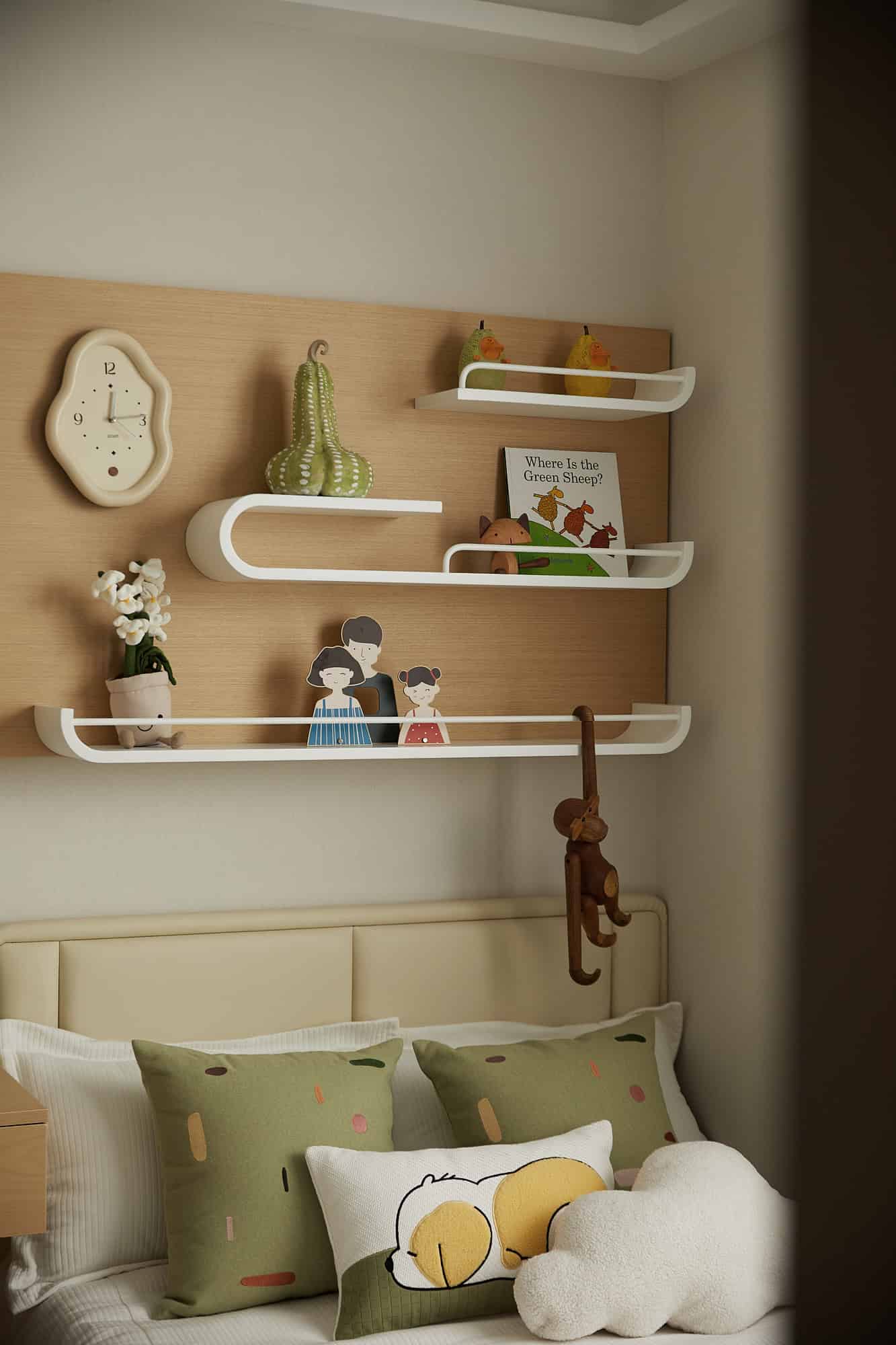 The project’s material palette is grounded in natural wood, soft whites, and warm textiles, creating a sense of coziness and connection to the environment. Every detail, from the cabinetry to the furnishings, reflects a commitment to simplicity and functionality. The entryway sets the tone with playful piano-key hooks that add a whimsical touch. The open kitchen and dining area feature clean lines and minimalist cabinetry, fostering a relaxed, family-friendly atmosphere. A balcony adorned with greenery provides a peaceful retreat, perfect for enjoying tea and quiet moments. This sense of calm carries into the master bedroom, where soft bedding and warm lighting create a restful sanctuary. The children’s room embraces a jungle theme, with green accents and playful animal motifs fostering a sense of adventure and imagination.