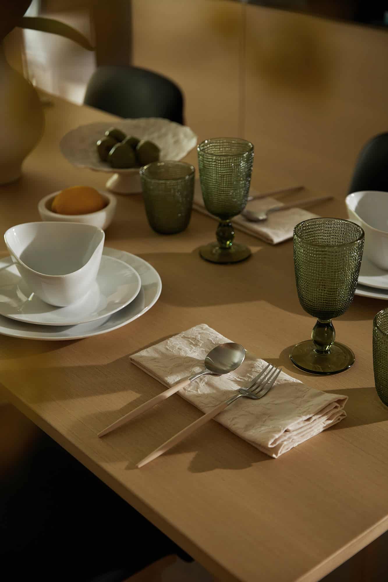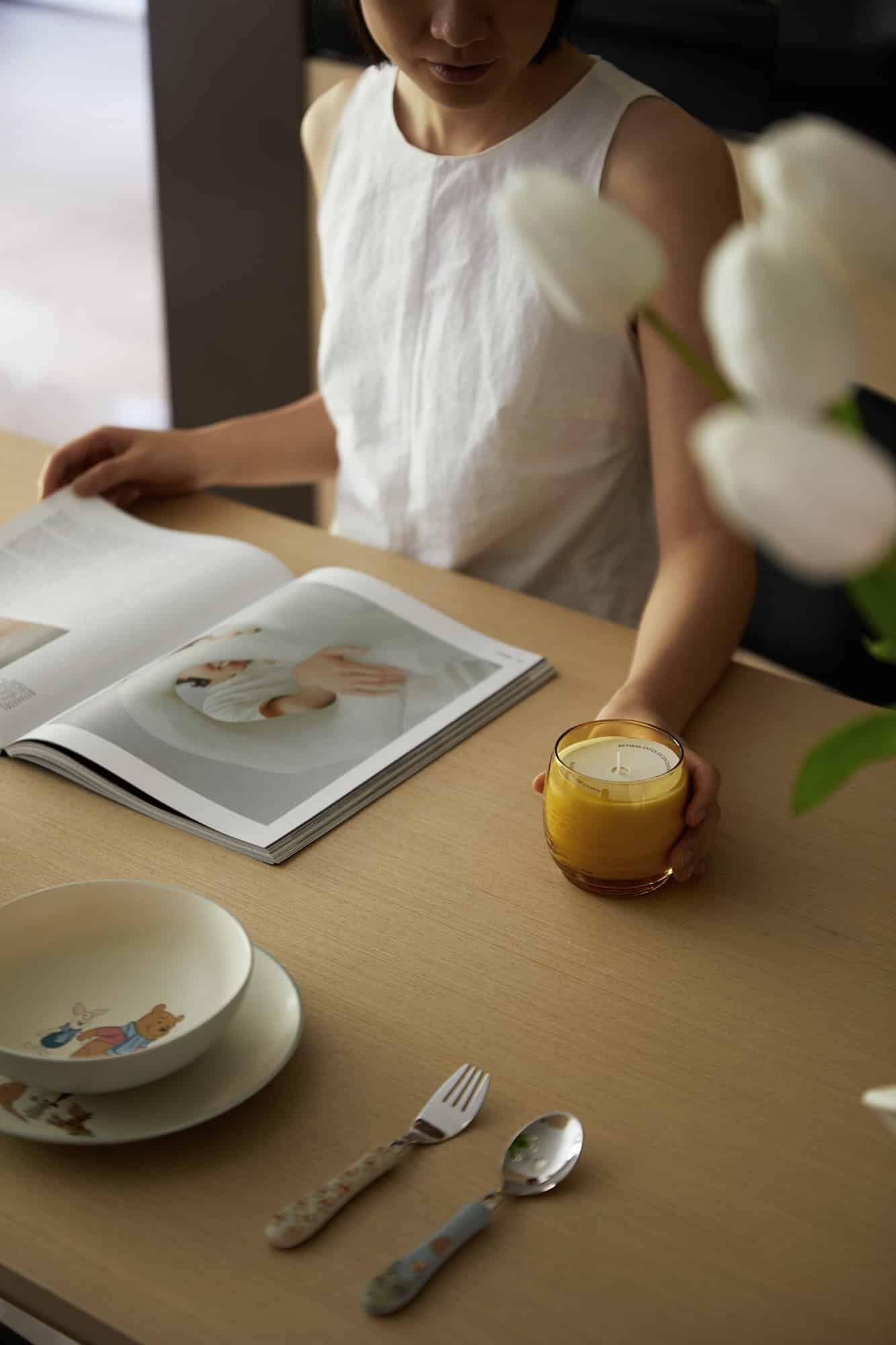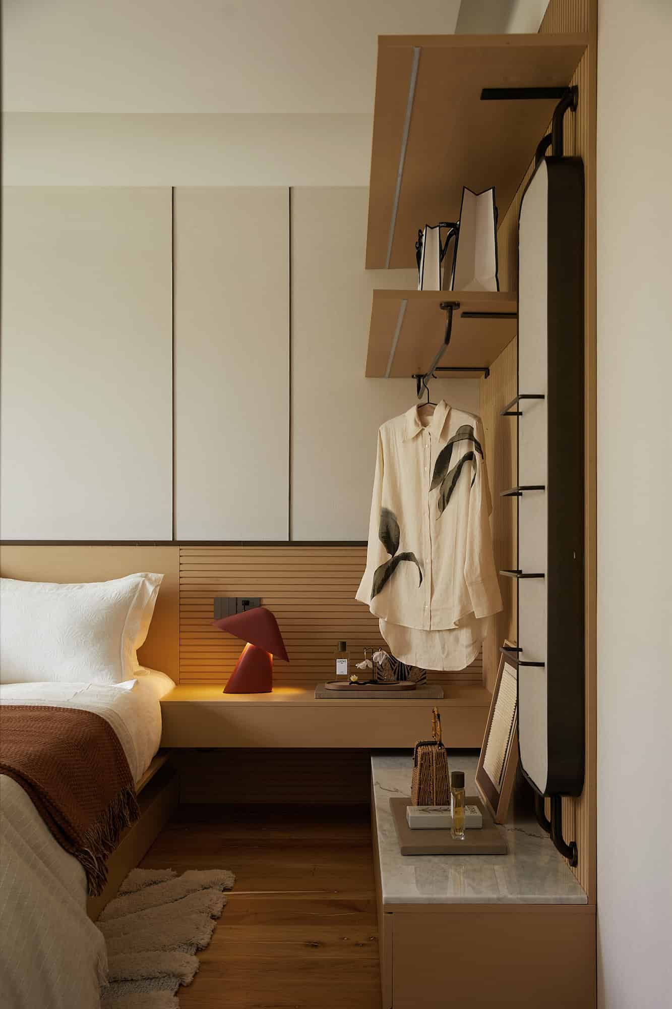 The project’s material palette is grounded in natural wood, soft whites, and warm textiles, creating a sense of coziness and connection to the environment. Every detail, from the cabinetry to the furnishings, reflects a commitment to simplicity and functionality. The entryway sets the tone with playful piano-key hooks that add a whimsical touch. The open kitchen and dining area feature clean lines and minimalist cabinetry, fostering a relaxed, family-friendly atmosphere. A balcony adorned with greenery provides a peaceful retreat, perfect for enjoying tea and quiet moments. This sense of calm carries into the master bedroom, where soft bedding and warm lighting create a restful sanctuary. The children’s room embraces a jungle theme, with green accents and playful animal motifs fostering a sense of adventure and imagination.