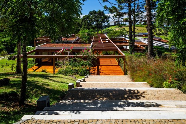 The wooden grid, supported by a set of concrete pillars, is set on the hill on two sides, as if sprouting from the ground. At this point of contact, the land is engraved by several walls made up of stones drawn from the same area. To avoid an excessive number of pillars in the 2000-square-meter structure projection, and to provide wider open views of the garden below, large trussed beams in cor-ten steel are placed at each two modules, each one of them 11 meters long. These beams, together with the landscaping, make up an important part of this work.
