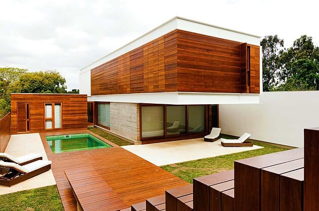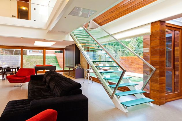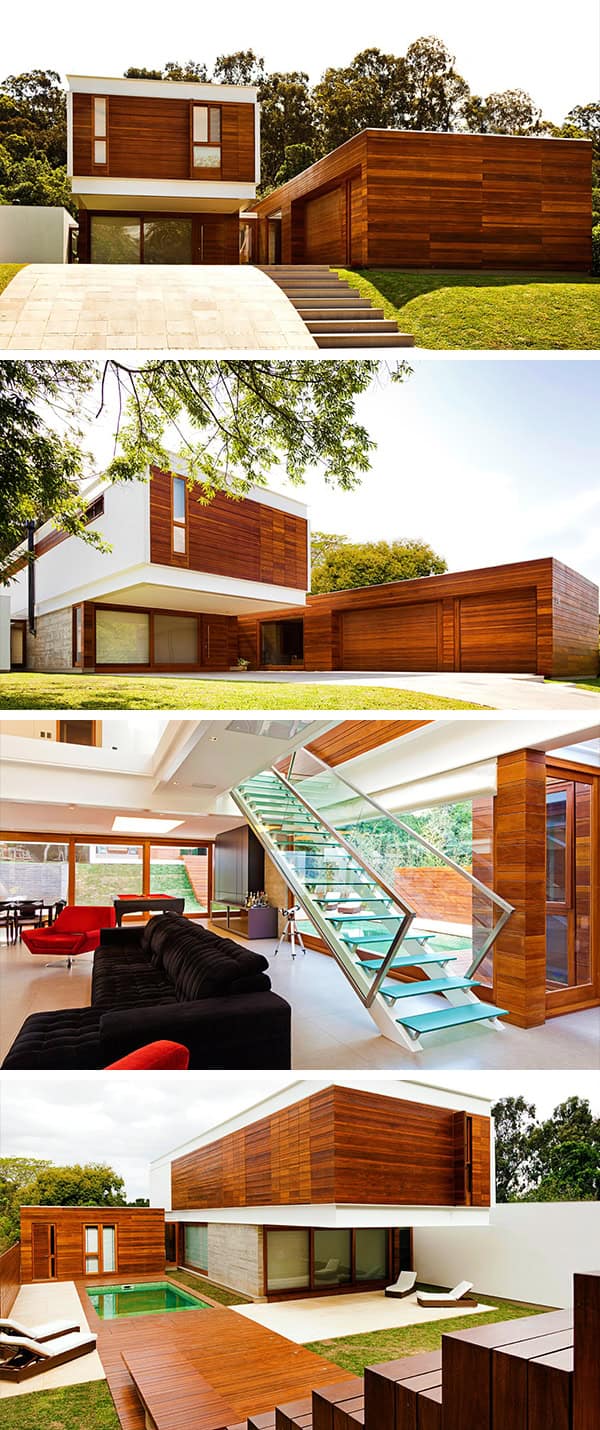 The Brazilian studio 4D-Arquitetura have completed the Haack House which is a beautiful two-story contemporary residence located in Guaiba, Brazil. The house’s exterior features strong wooden applications with a simple swimming pool and a very interesting stairs design. The structure of the building was built on girders made from metal and pillars along with two large concrete planes that serve as support.