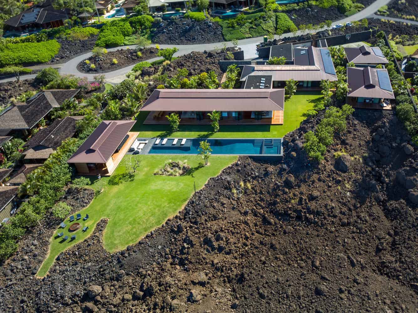 Upon entering the home, visitors are led through a densely landscaped sequence of berms, trees, and lava, culminating in a panoramic view of the Pacific and Maui beyond—an architectural reveal that encapsulates the essence of the retreat.