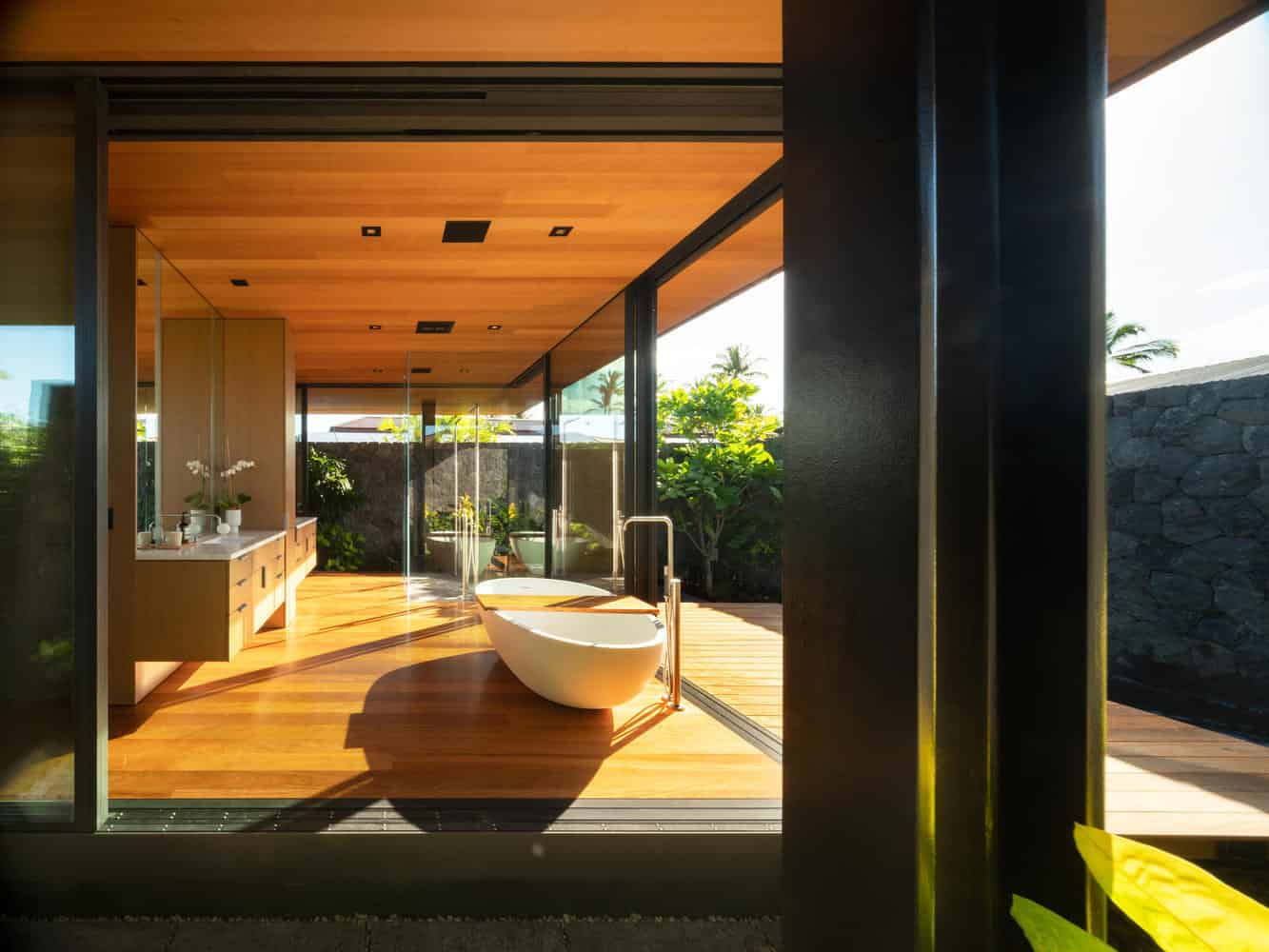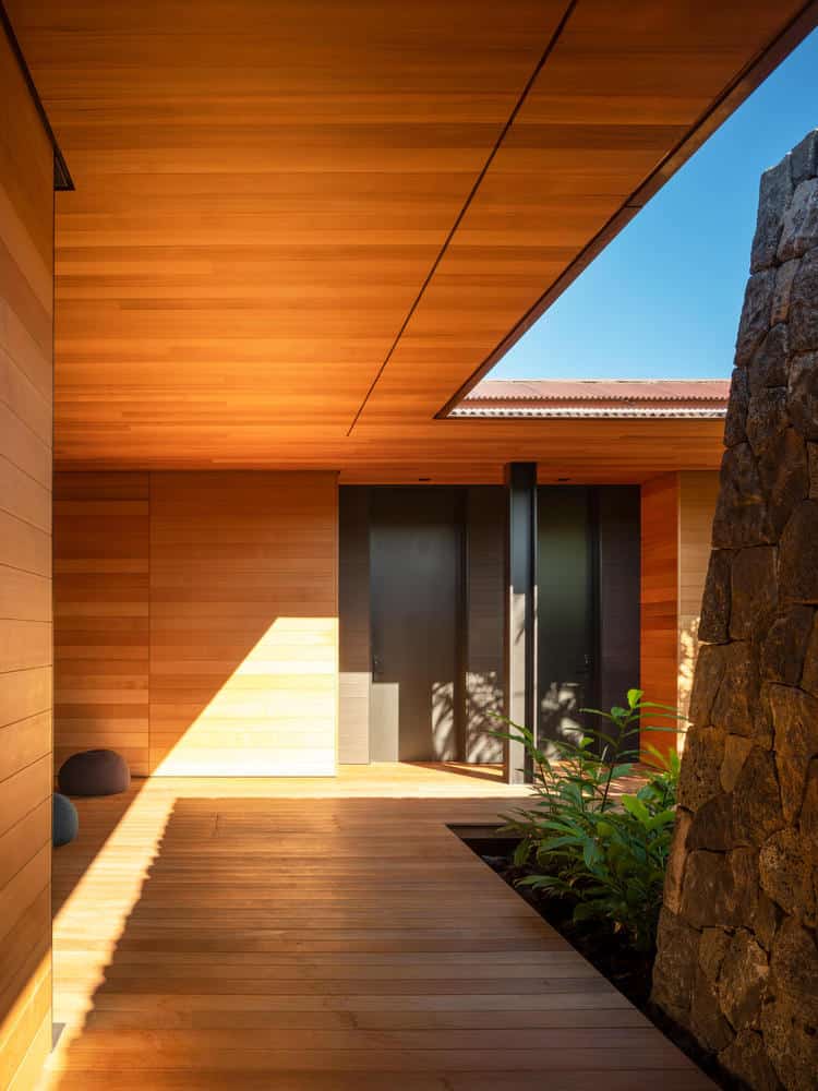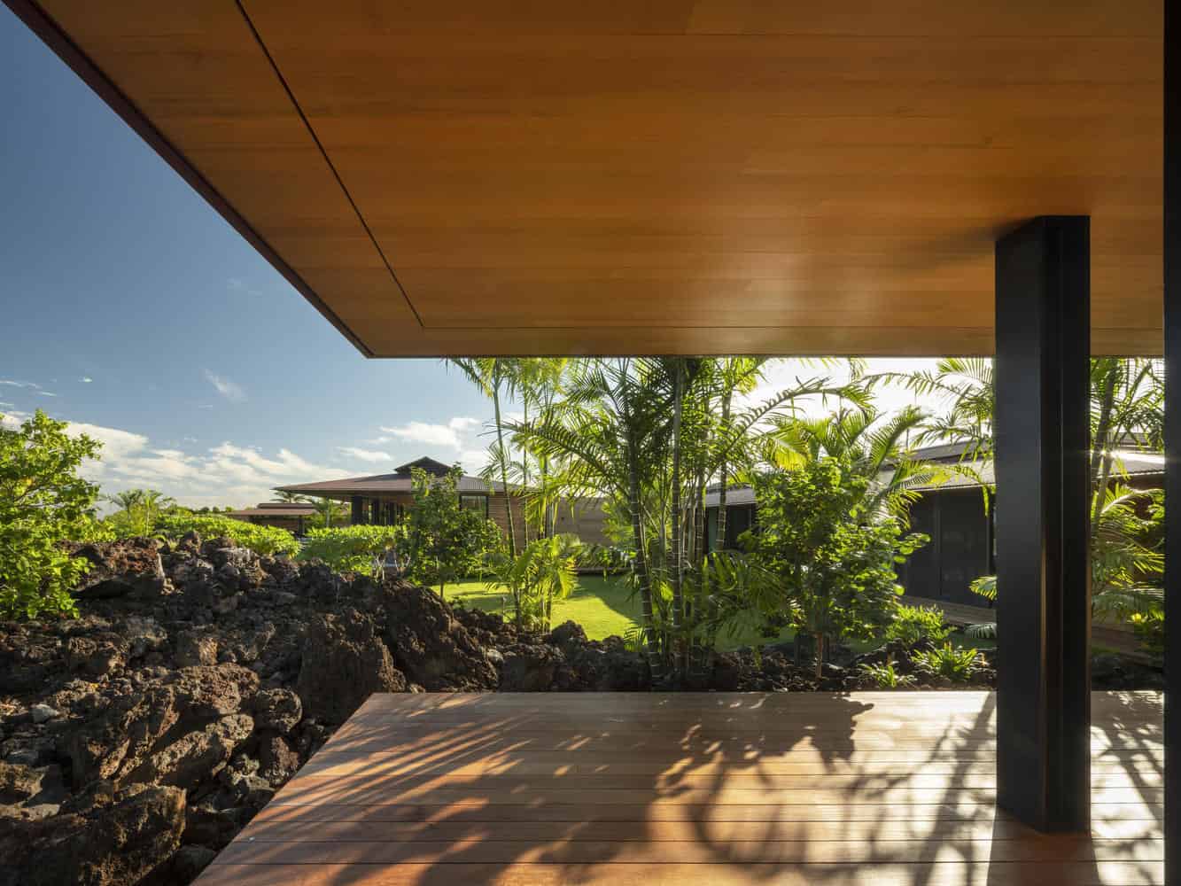 Custom operable wood shutter screens allow occupants to tune light, air, and privacy throughout the day. Many of the home’s lava rock walls continue uninterrupted from inside to outside, grounding the home in the Kona landscape and reinforcing the sense of harmony between built and natural environments.