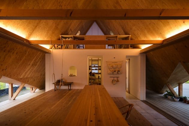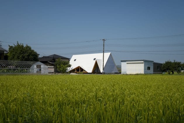 Takeru Shoji Architects have designed the Hara House in the rural area of Nagaoka City in the Niigata Prefecture of Japan. Immediately noticeable, the Hara House takes on the shape of a tent, except that it is built from a wooden truss structure, surrounded by a lush, green field, a work shed, garage and a farmhouse. The new residence has a strong connection to each of the entities surrounding it.