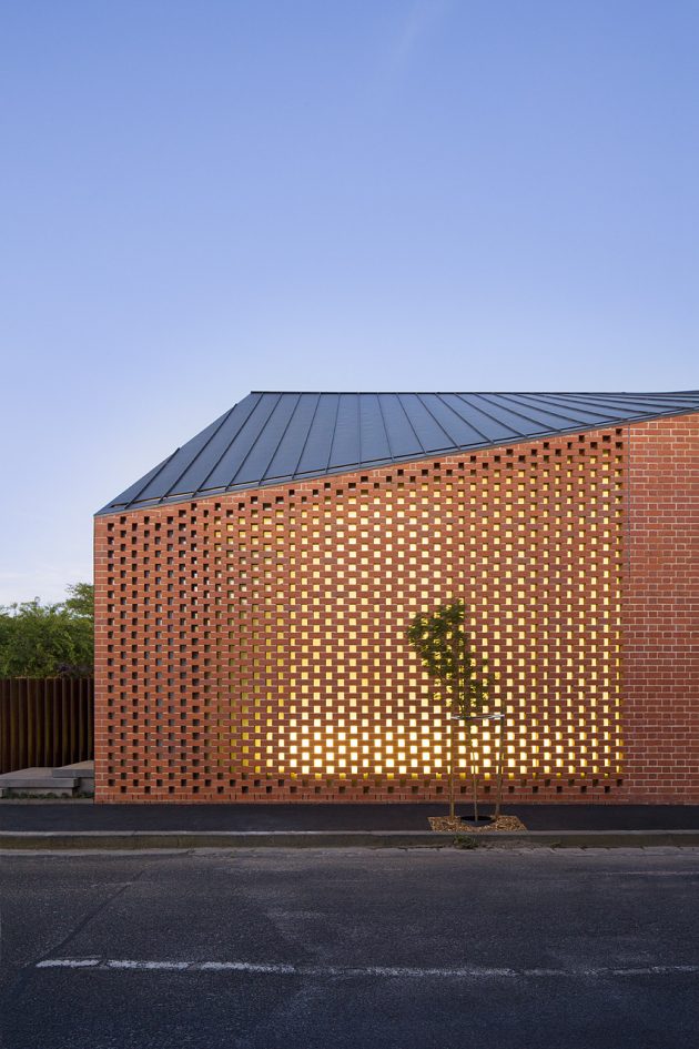 “The pressed red brickwork and sweeping roof form pick up and reinterpret elements of the surrounding built fabric. The brickwork is further articulated by a section of honeycomb brickwork and steel grid screening, providing a perforated layer between street and the internal spaces.”